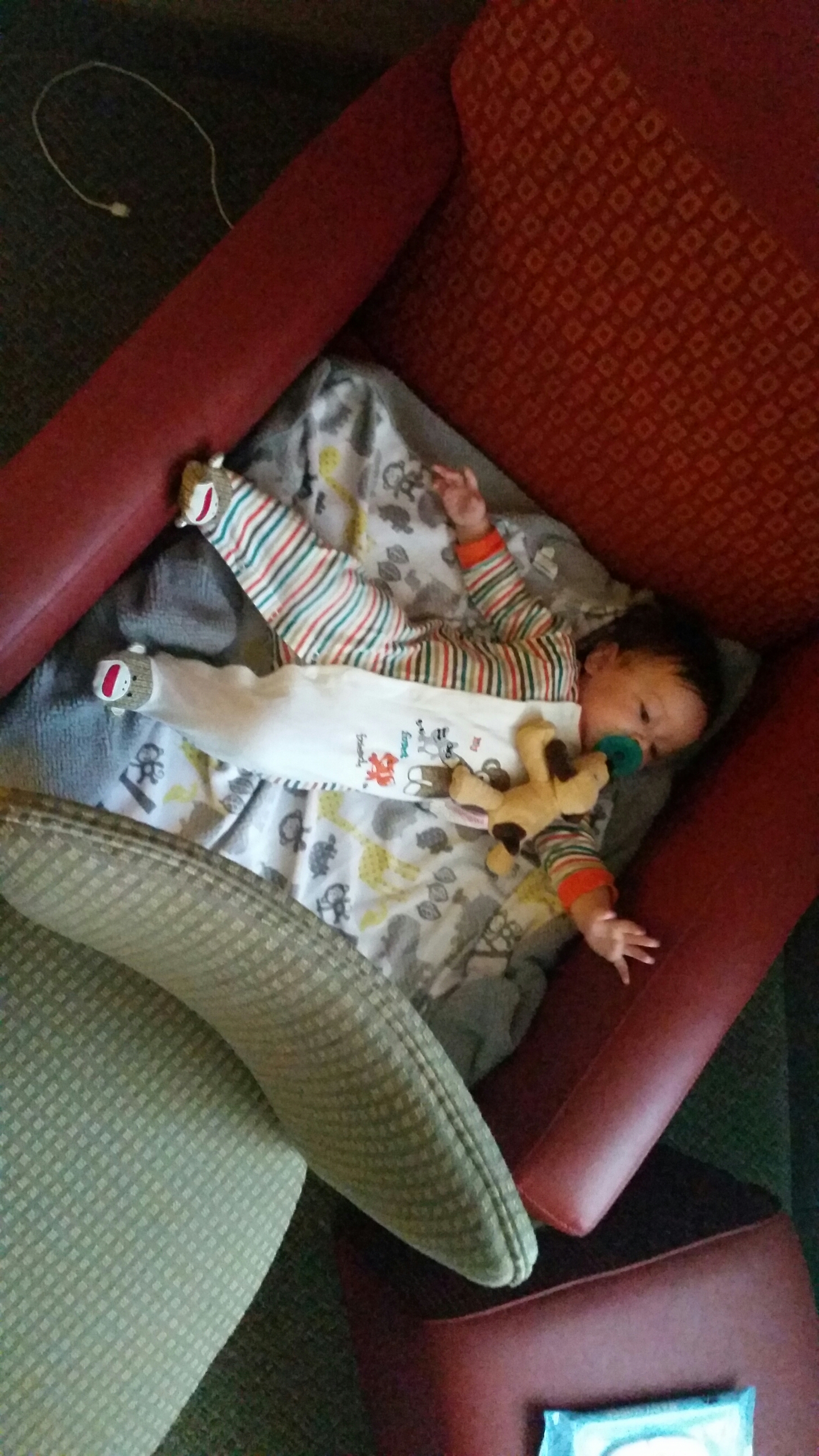 When we got on the hobo cruise there were obviously no big comfy chairs or couches we could use so we thought we would try the floor again. This didn’t seem to work as well as we were hoping. By the middle of the night she was up in the bed sharing with me. Neither D or I were big on co-sleeping so this was the first time we had shared a bed the whole night. To make sure I didn’t roll over on her (one of my biggest fears) I slept with her at my feet. This also helped with her tendency to want to stick fingers toes and her face in my face. This was the situation for the rest of the hobo cruise and it seemed to work for us.