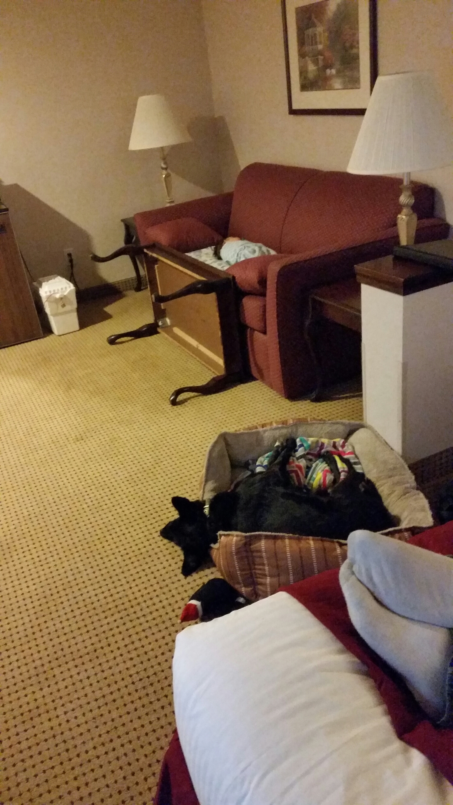 The two nights before we left we had her sleeping on the floor on a big fluffy blanket folded up plus two of her own blankets. This seemed to work very well. She slept like she was in her crib and we figured as long as we kept this in mind we should be good. The first night we stuck with this set up. It worked pretty well but was obviously not her crib. When we got to hotel #2 we decided to try a trick I remembered my parents doing when my little brother was young. We put BB on the chair in the room and blocked her in with one of the desk chairs. This worked like a charm. Therefore, the next night we tried the same and once again, worked like a charm.