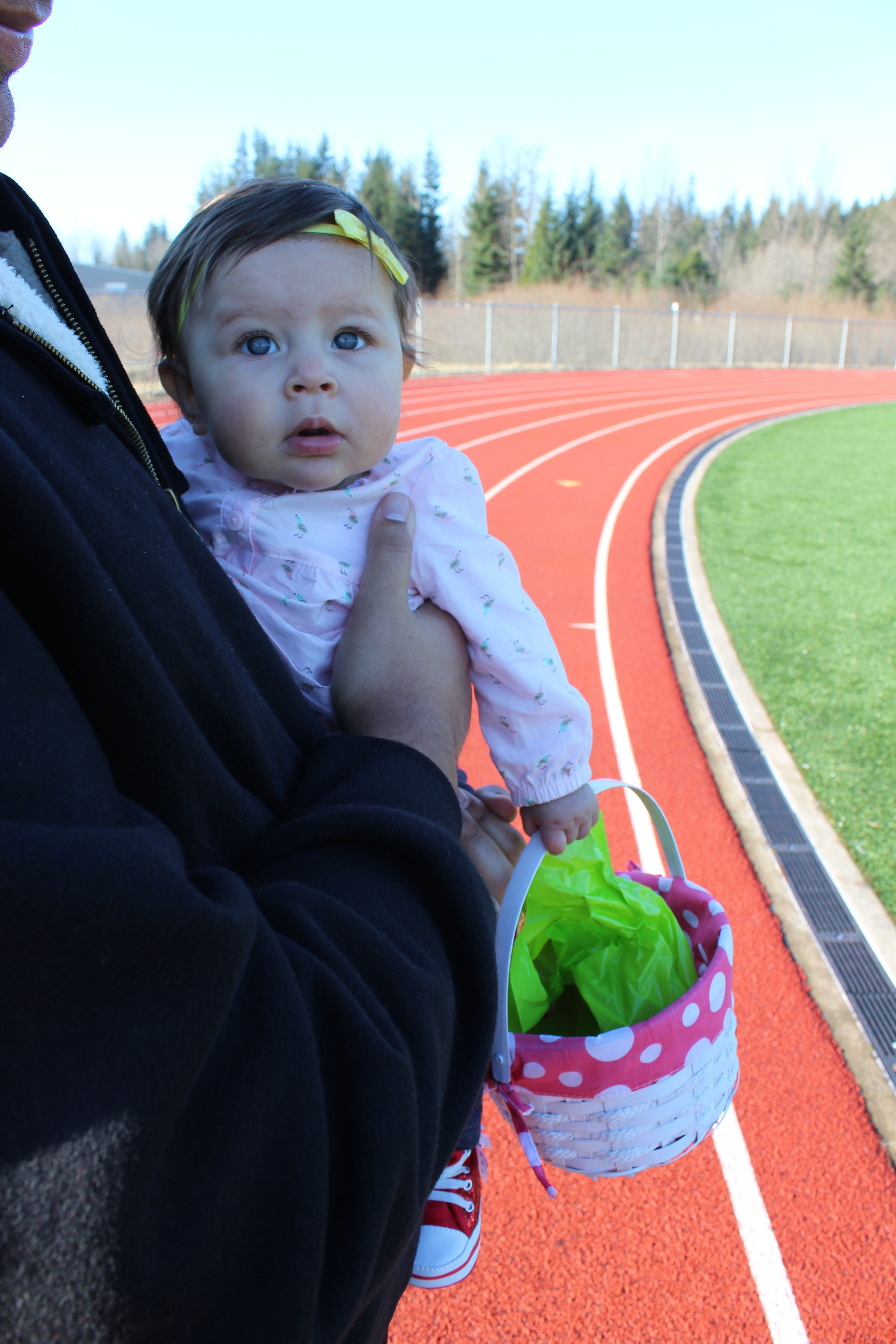 Today, as a family we went to a community egg hunt, BB was not really sure what was going on and we were sort of hoping to maybe meet some families or at least some mommy friends for me. Well BB waited patiently for them to say go and she got two eggs!! She is not walking or crawling so finding eggs consisted of us hovering her over an egg and her picking it up and putting it in the basket. It was successful and quite fun. BB enjoyed watching all the little kids and I think she had a good time she wanted to stand up and look around and would fuss whenever we tried to hold her. She is growing up so fast I can’t stand it!!