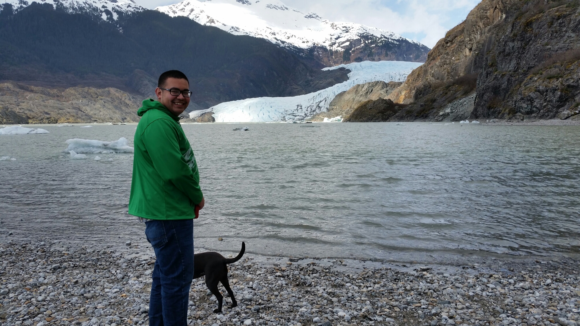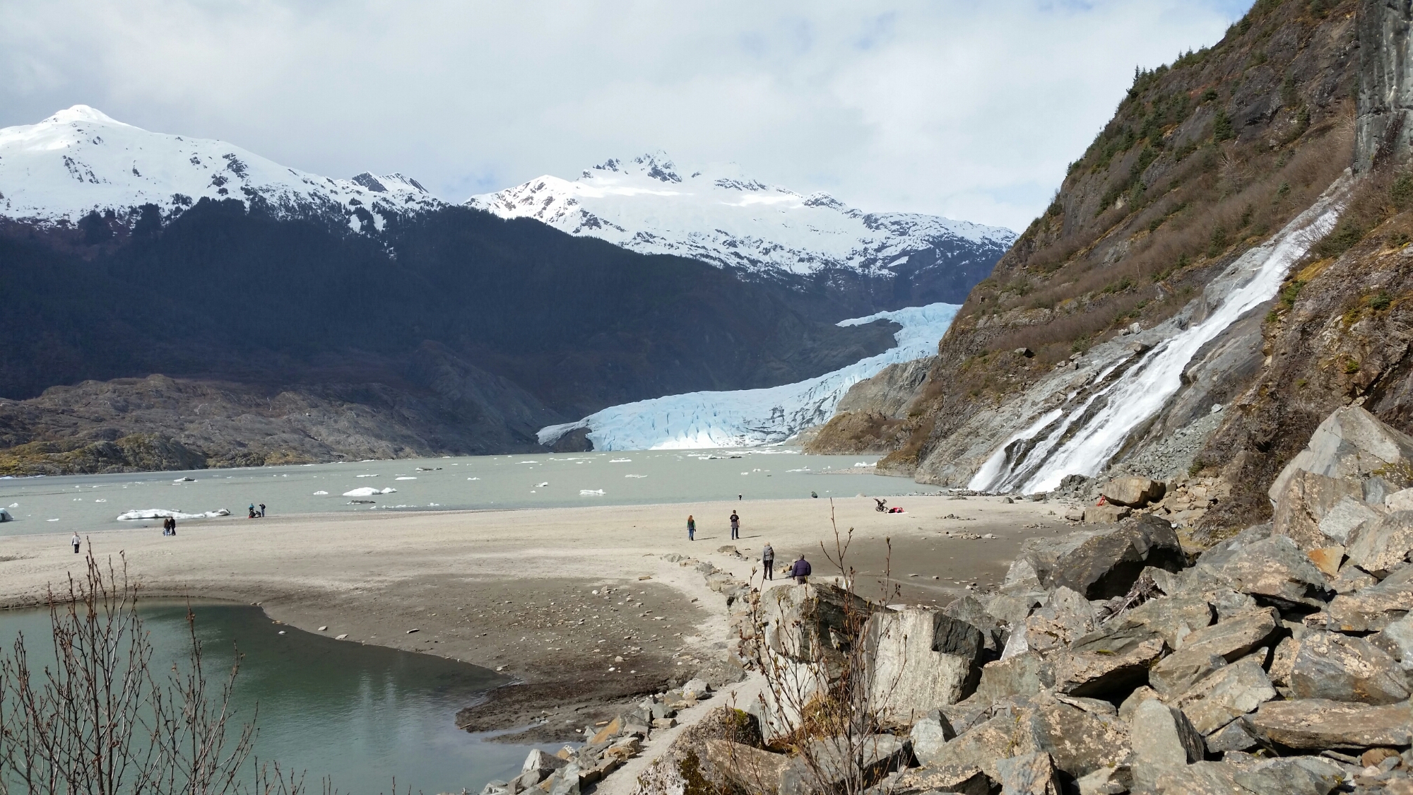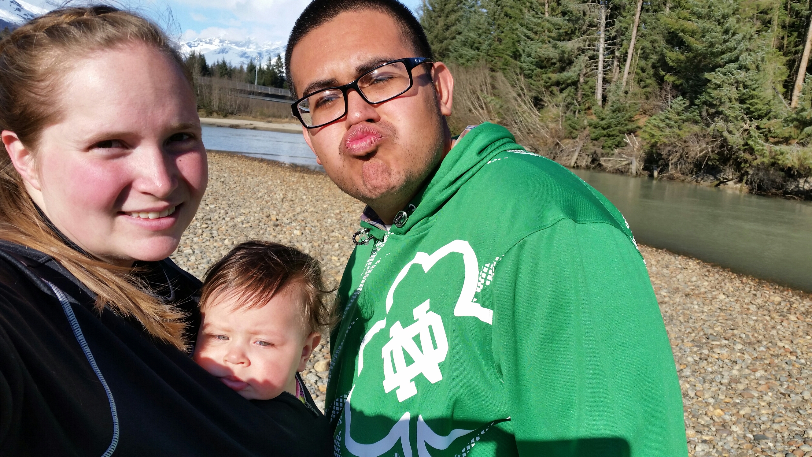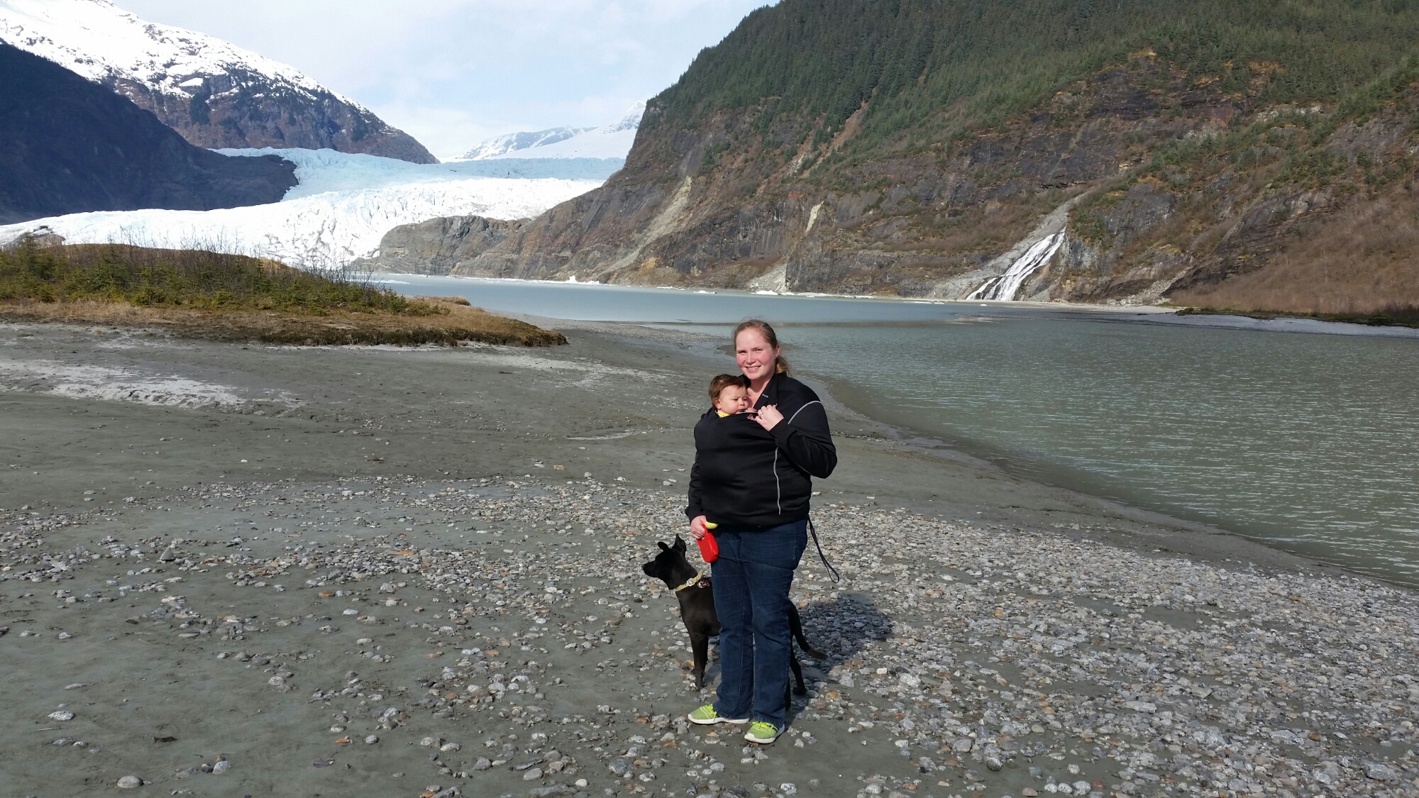 After that we decided to go for our hike. We packed up and drove the 2 mins to the glacier. From there we followed the trail to the waterfall that was right by it. It was a well paved easy 2 mile hike and BB only made it 1/2 mile before she finally gave in and fell asleep. She used to fall asleep all the time on walks but you can tell she is really interested in seeing her surroundings and learning what all is out there now. R loved the hike she really enjoys running around like a crazy dog in the sand. Hiking in Juneau is so different from what we are used to. There are waterfalls, creeks, rivers, moss, and just water everywhere. You can’t follow your dust trail home. With that being said I feel like a little kid in a candy shop when we go hiking. I want to run and check out each waterfall and go see all the creeks and rivers. This waterfall was huge and did not disappoint. At the base of the glacier there is a beautiful lake and again I haven’t really ever seen an entire lake frozen over so it was quite exciting to see the layer of ice over the lake and there were also huge chunks of ice floating in it. I was like a little kid throwing rocks onto the ice hoping to break a hole through. R kept trying to challenge the mini icebergs that were close to shore. There were a lot of families out and about today and I couldn’t blame them it was beautiful!