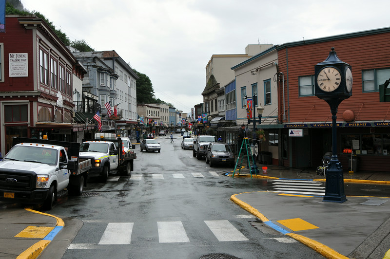 Trying to avoid as many generalizations as possible, in Arizona when it rains it typically rains for as long as its going to rain and then is done. You can generally count on that and unless its monsoon season it typically is a small random rain shower. D and I both grew up in Arizona and so this thinking is all we know. With that being said Friday we decided to go out and sort of explore downtown. It was a little rainy but as we drove around it stopped. Parking in downtown Juneau is similar to downtown Flagstaff, very narrow streets, most of them one-way, with parallel parking. D is not a parallel parker and so we ended up parking a little bit away thinking a nice little walk would be good and we could look into the windows of stores and decide on a place to eat. So we set out, the sun starting to peek out of the clouds. It was a very nice evening and we finally ended up at a pizza shop. We enjoyed dinner and even treated ourselves to ice cream afterwards. On our way out I peeked out a window and saw that it was pouring rain. We weren’t really prepared for that, I had on a sweater and BB only had a blanket. Also, remember that brilliant idea we had to park a bit away and walk around…that came back and bit us in the butt.