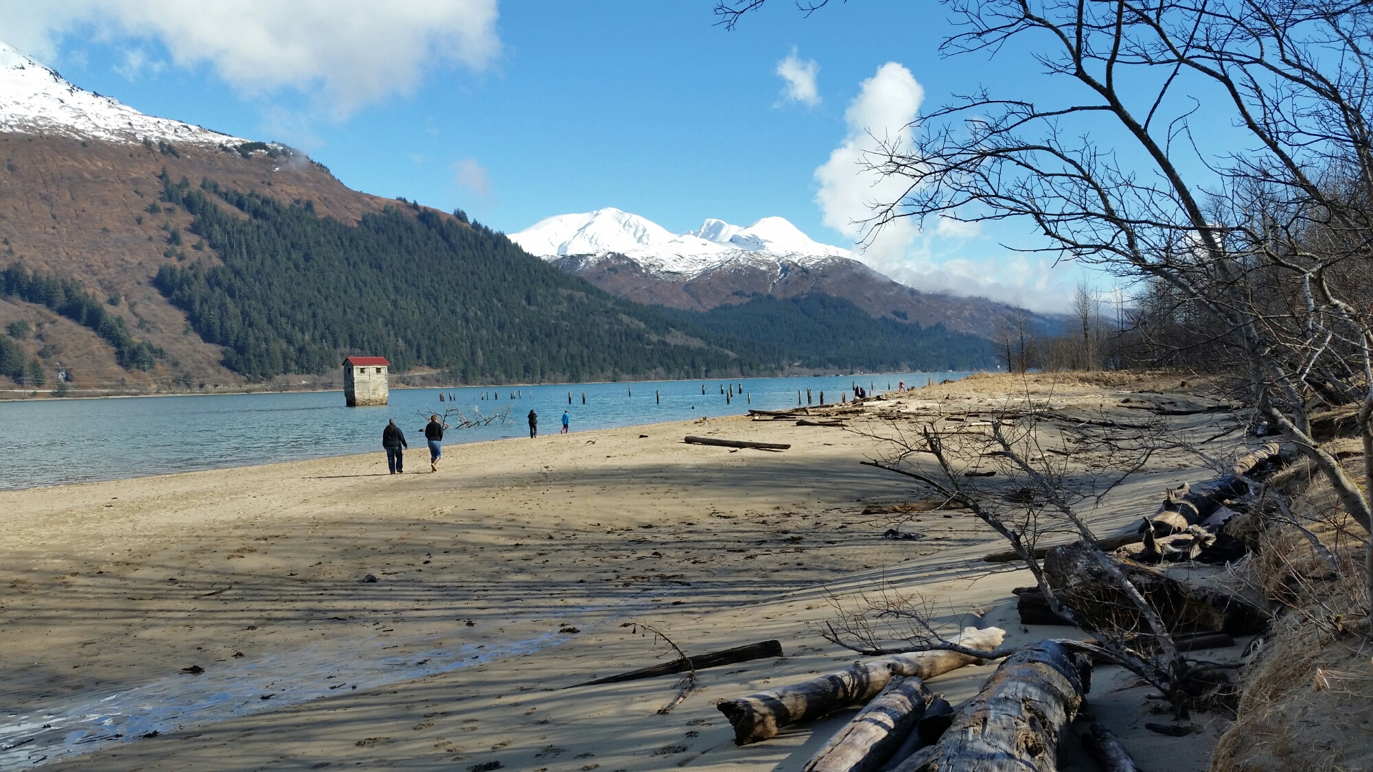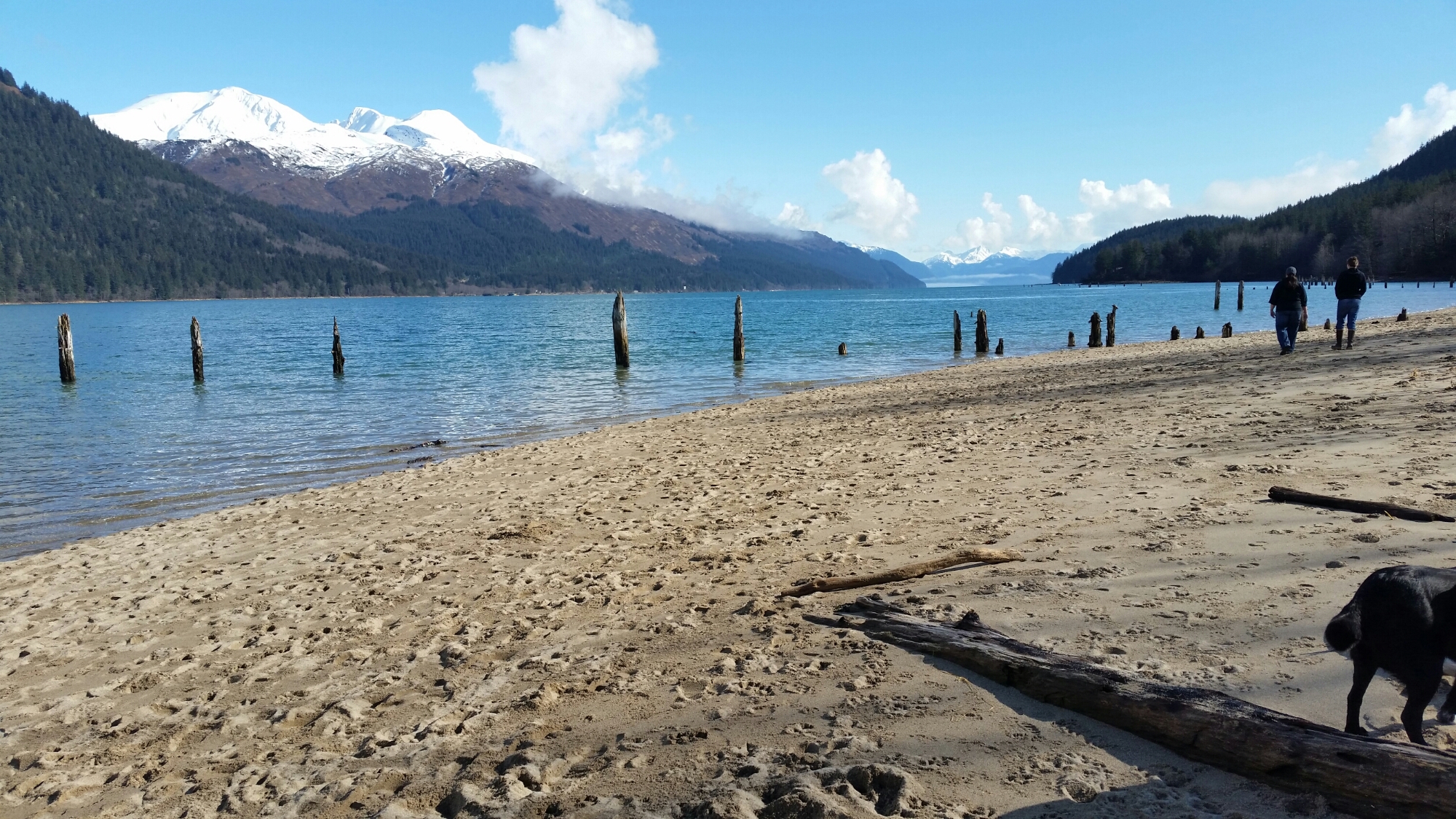 There is one beach in Juneau, called Sandy beach, of course. On Sunday the sun was out and it was a beautiful, clear day, and we decided that we should go check out this beach. We packed up the dog and the baby and head to the beach. R was so excited to get out of the house and go for an adventure she couldn’t sit still. Once we pulled up there were dogs and people enjoying the warm weather everywhere. We got BB all set up in her wrap and we got R ready to go and we set off. It was odd being at a beach with snow capped mountains in the near distance. At first we walked through a wooded part and just enjoyed the trail then R decided it was time to play on the beach she lead us through a small trail right to the water. She was loving the beach, rolling around and running around. BB also was having a grand time. She has been very interested in watching R and thinks she is rather funny. She also thinks her daddy is quite a goof. She was squealing and laughing the whole time.