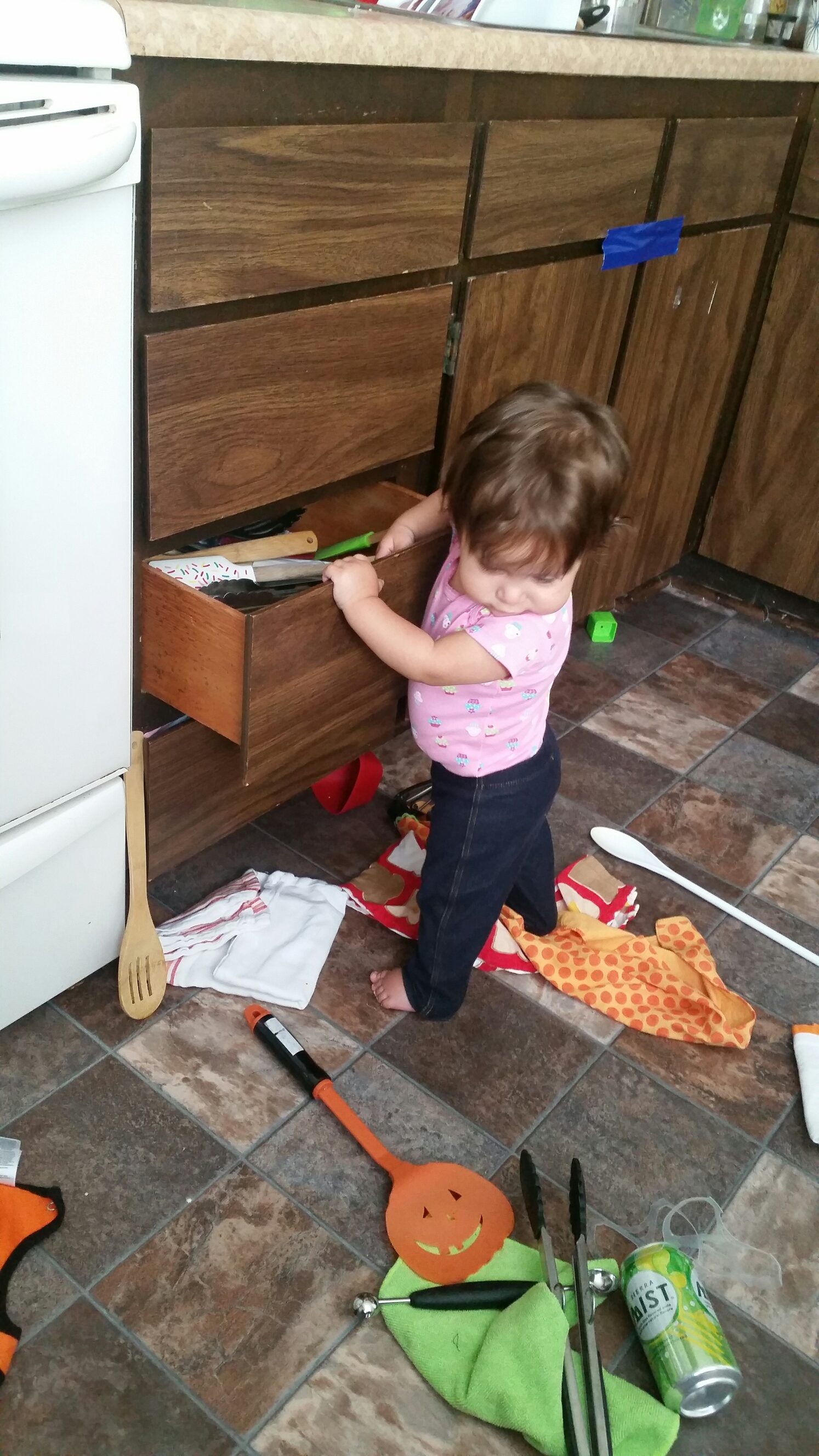 - Loves to take things out of containers and cabinets and recently learned how to take things out of the drawers in the kitchen (thank goodness we were prepared when we moved in and all the baby friendly items are at her level)