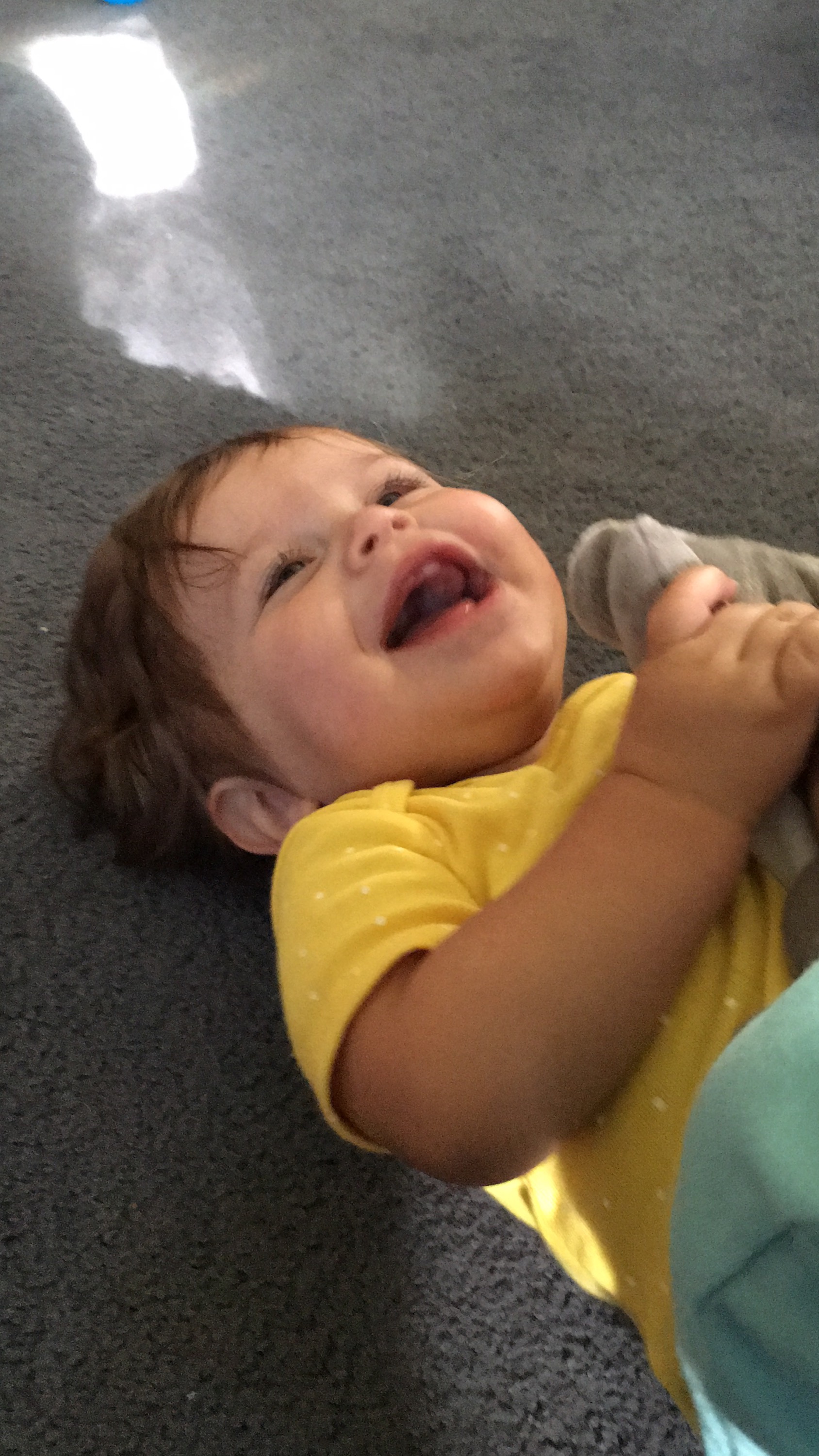It popped through over the last couple days! While we are so excited she has finally joined the teeth game she has once again made it clear she is doing things her own way. While I do think the bottom ones are trying to come in she cut her first tooth on her top front teeth! The second one is coming soon I can see it!! She is pretty feisty when you try to feel around her mouth so I can’t promise that the bottom ones aren’t closer than we think but I saw those top teeth poking through!