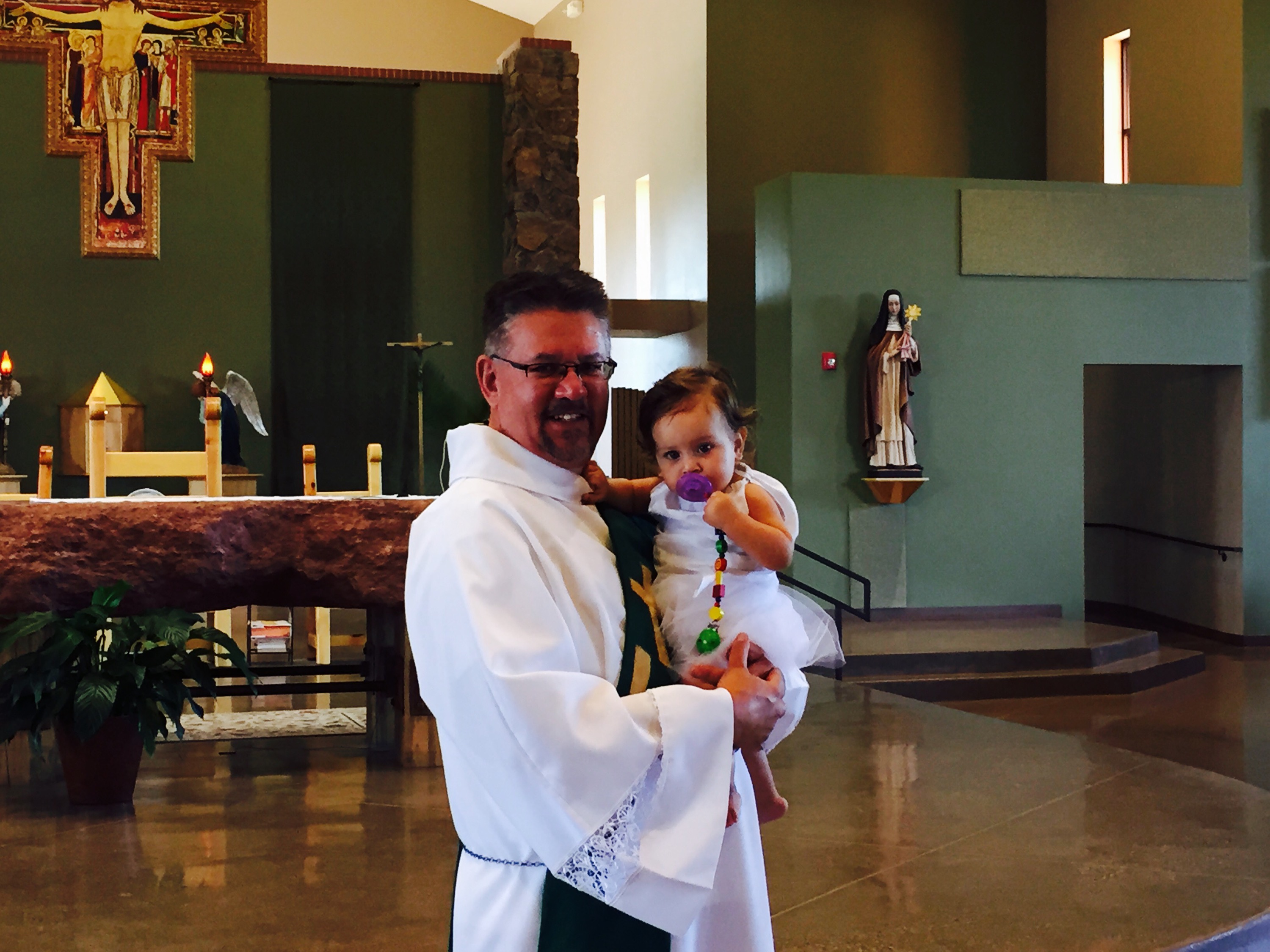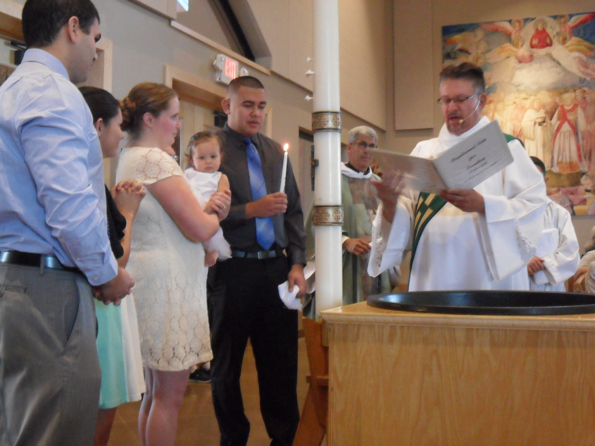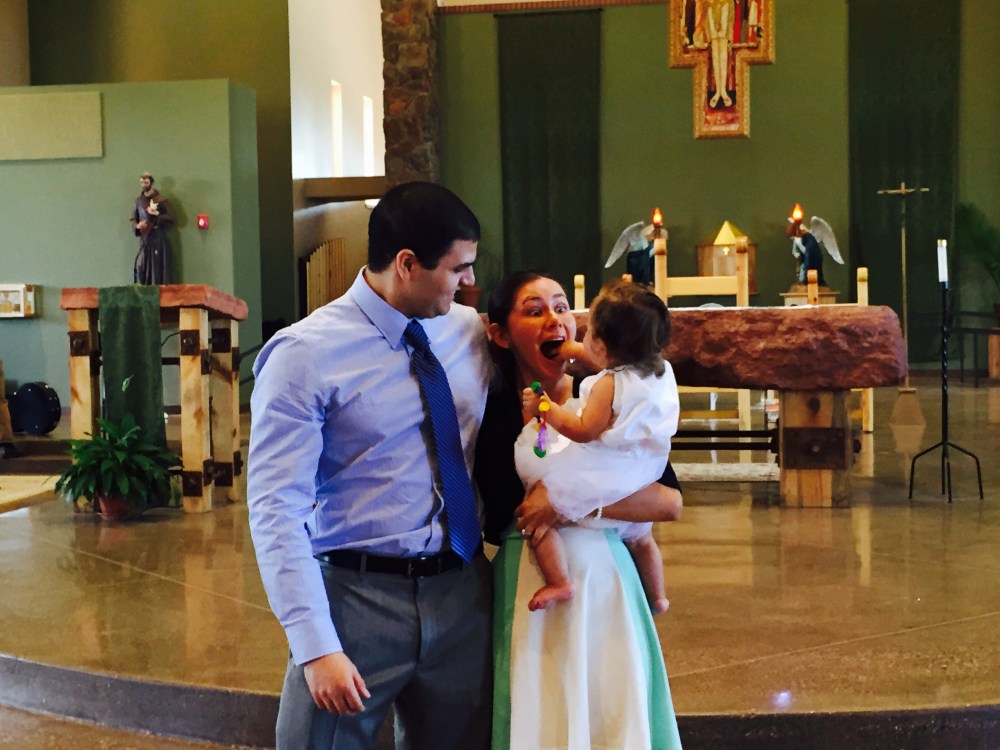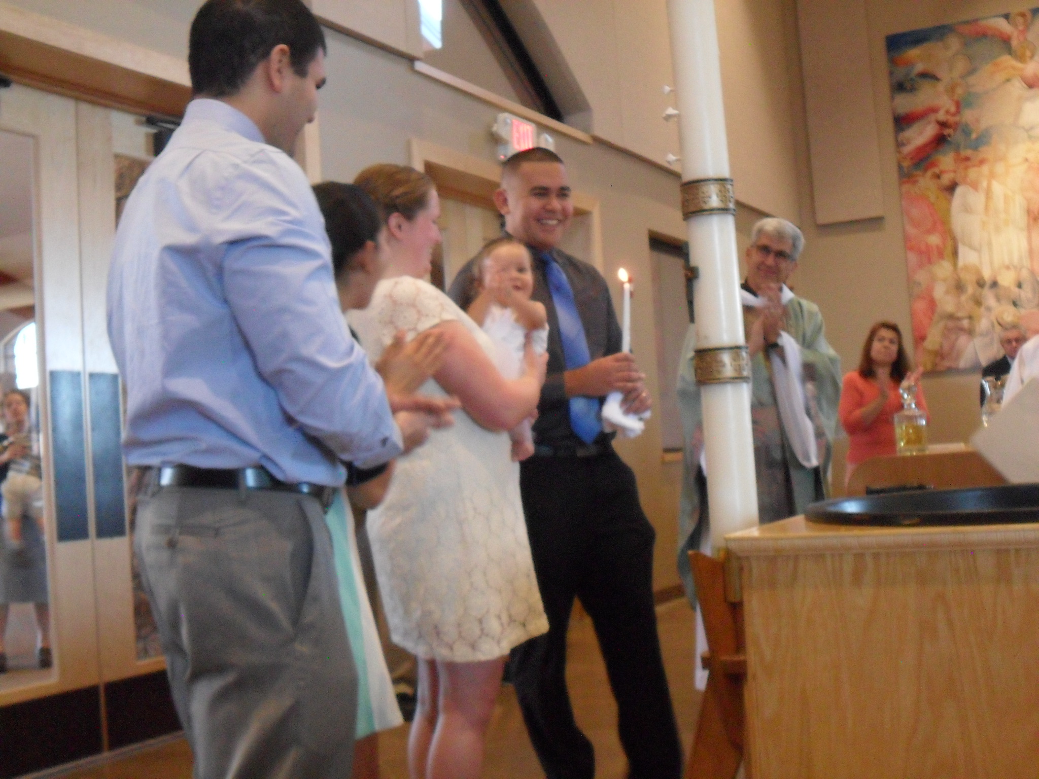 Let’s just say BB stole the show. She waved as we processed in and loved everyone looking at her. She did get a little sick of everyone wanting to touch her by the time we got to the front. When it came time for her to be baptized she was excited and wanted to play in the water. As with all baptisms they held her up for the congregation to see and being the goofball she is she clapped along with everyone else. She also was having fun waving as we would walk down the isle. She as usual talked the whole mass and wanted to play and walk/crawl around.