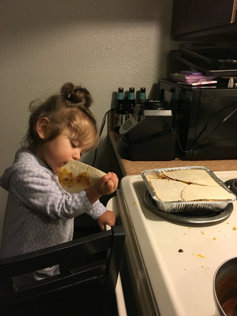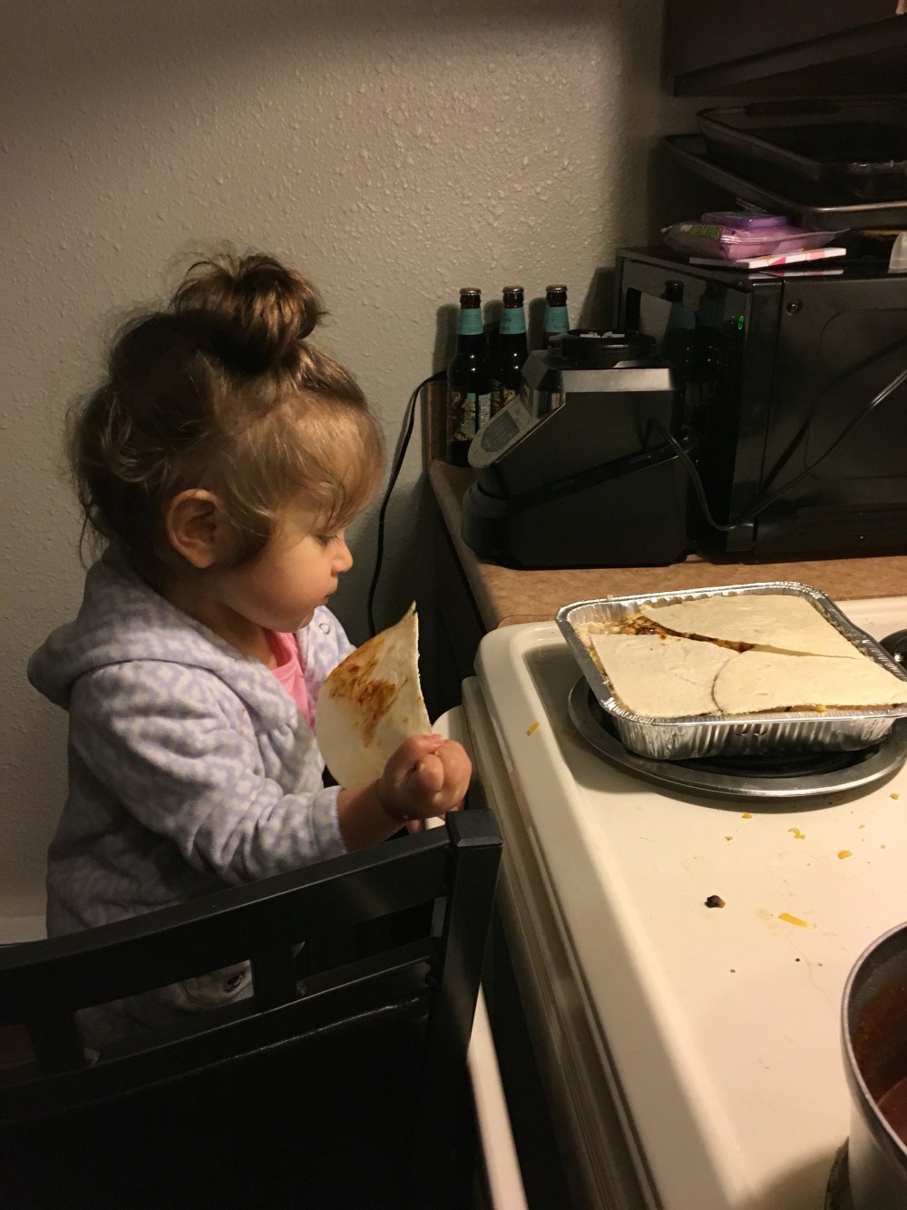 I have also been having her help me make dinner at night. When we are having a tough night it is the only way it gets done and she seems to enjoy it. Especially because that means she gets to eat a bit of the components that goes into it. This instance, enchiladas, she ate a good portion of the ingredients and was not afraid to move things if needed to get to more!