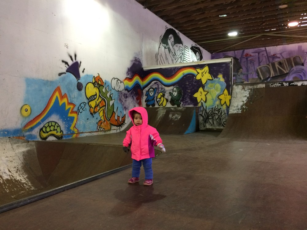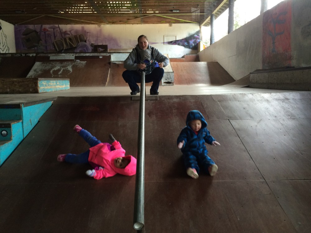 Remember the skate park? We love it! BB learned that she can slide down the ramps and we spent almost two hours sliding down the ramps with our friends.