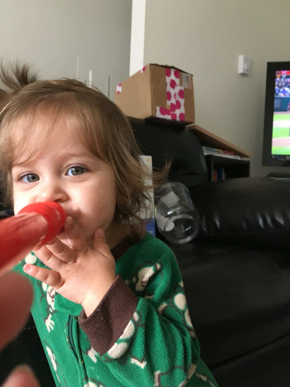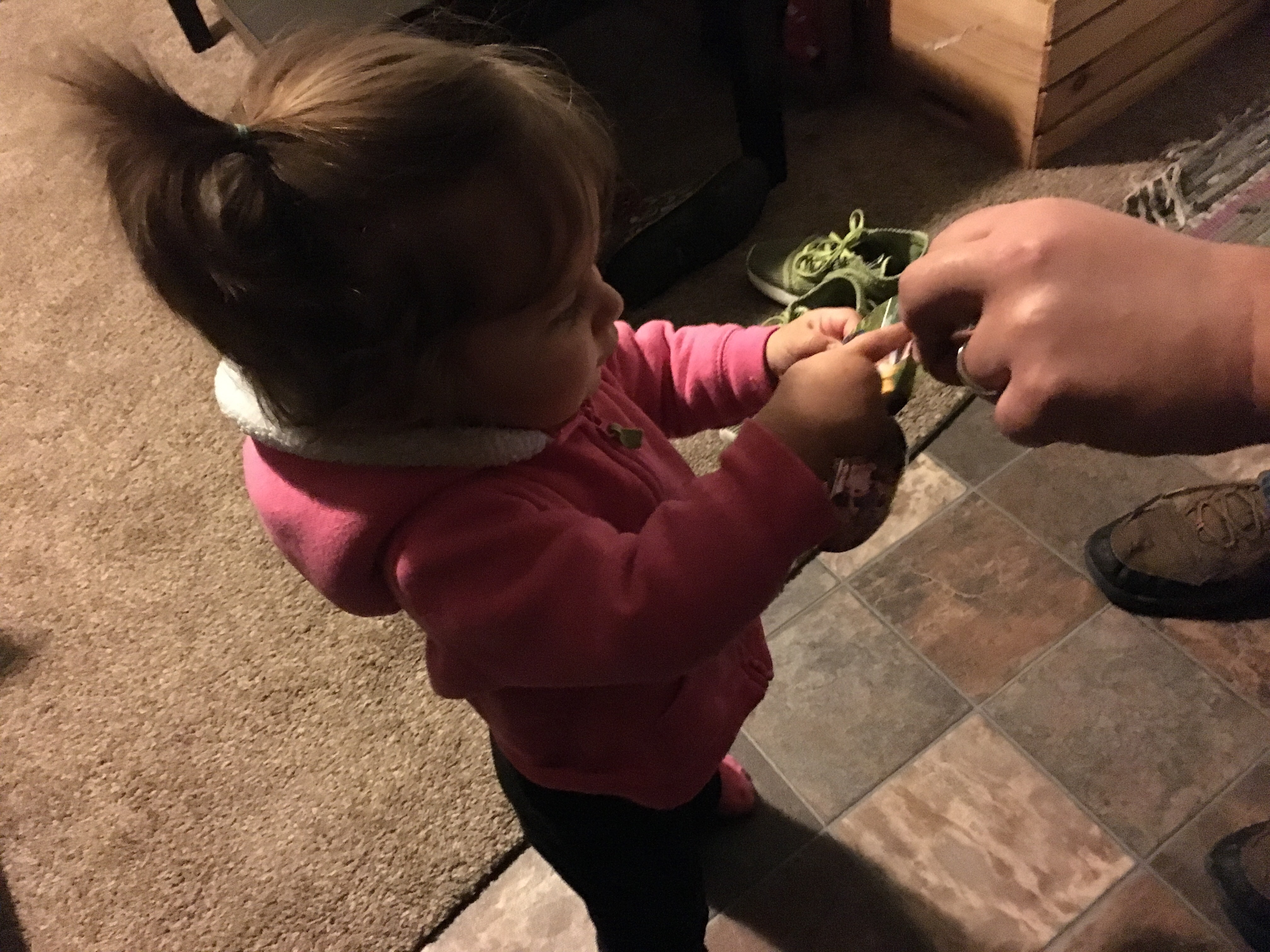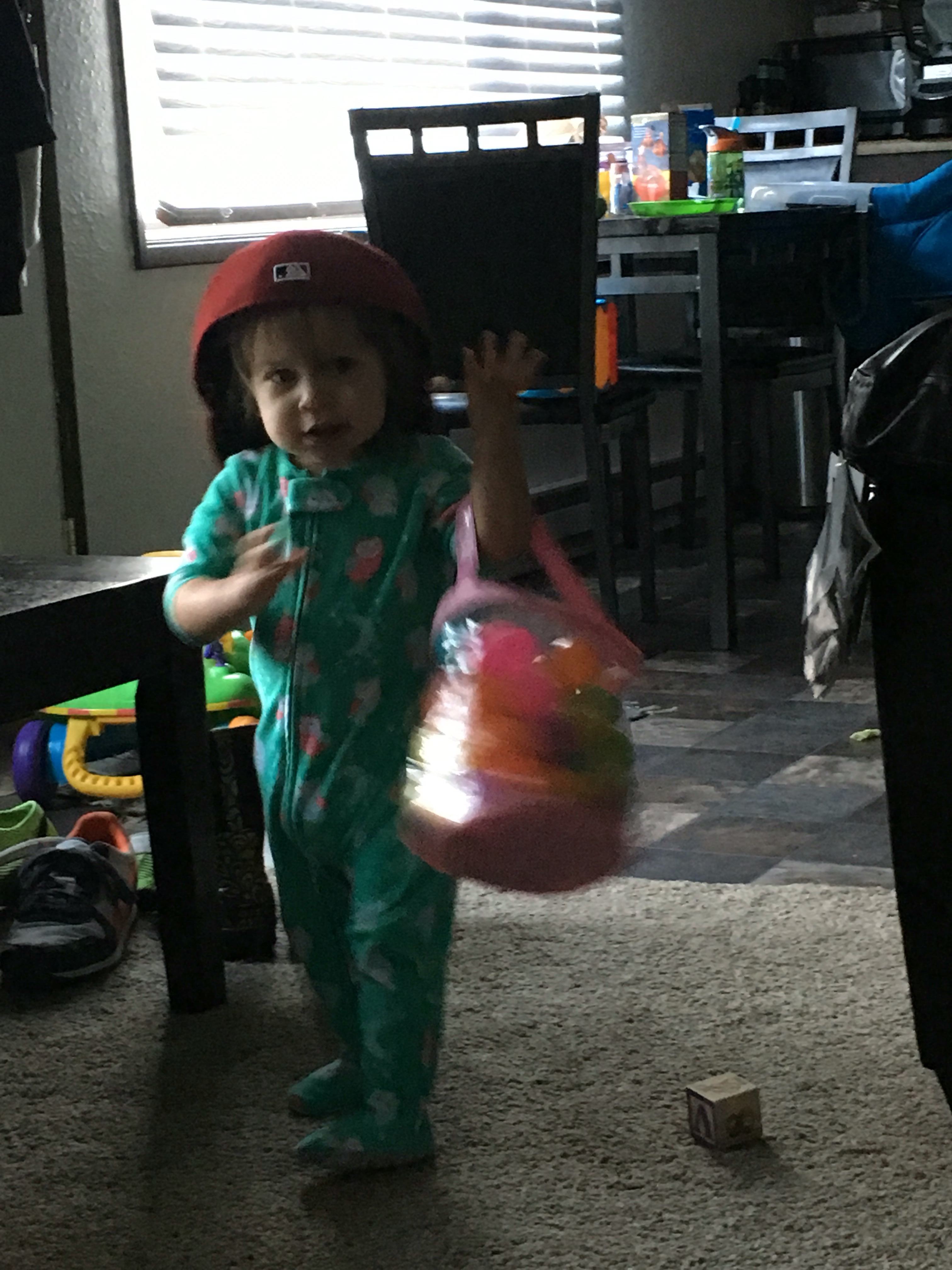 BB got a new hat! She loves the Llama Llama books, in particular Llama Llama Red Pajama and so we had to find something that rhymed with her name so that we could say a similar rhyme to her. We found a red fedora!