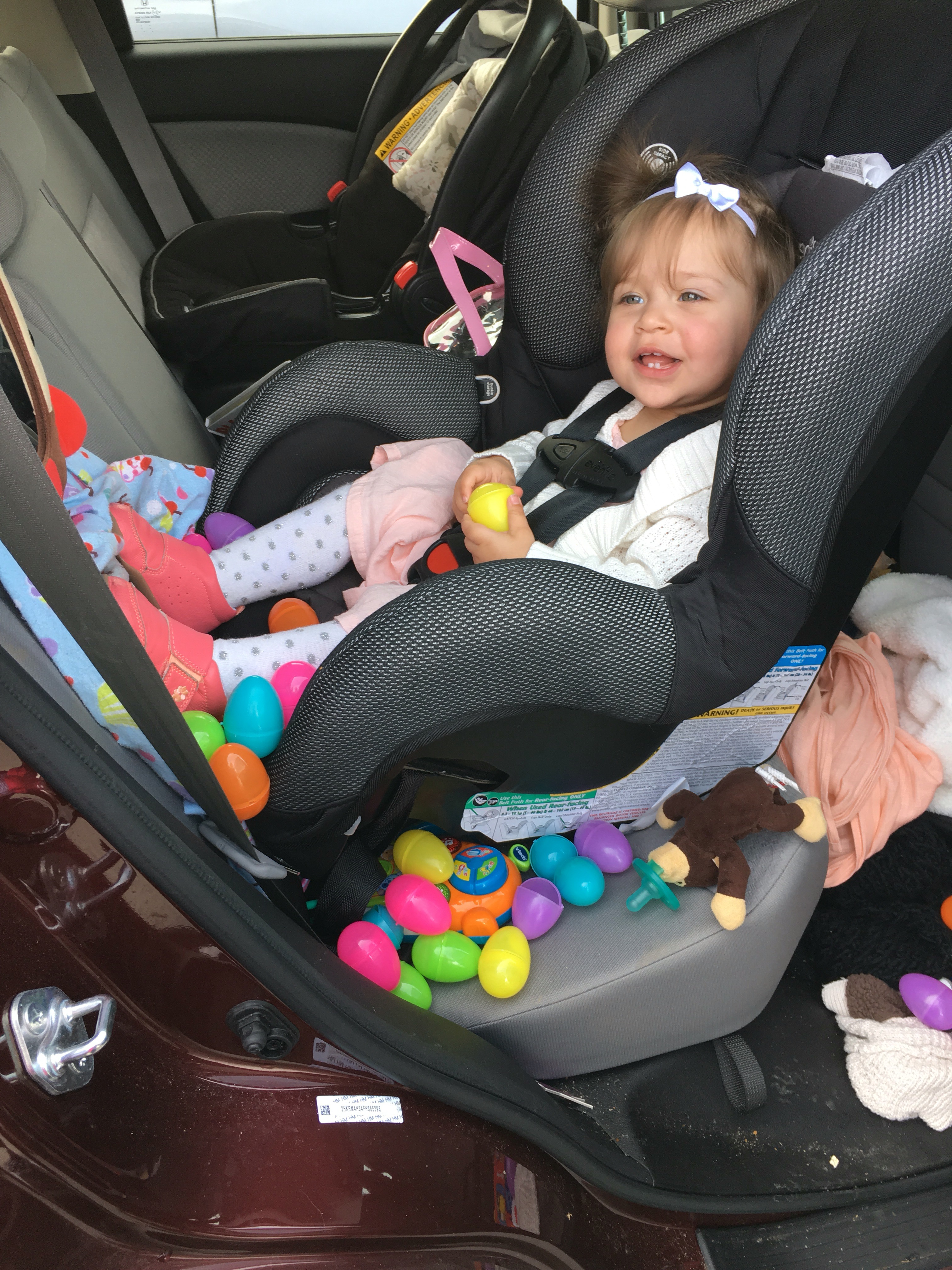 This instance, D assured me that she wouldn’t be able to open the container of 50 plastic easter eggs… after church she had some extra pent up energy and guess what… She egged my car!