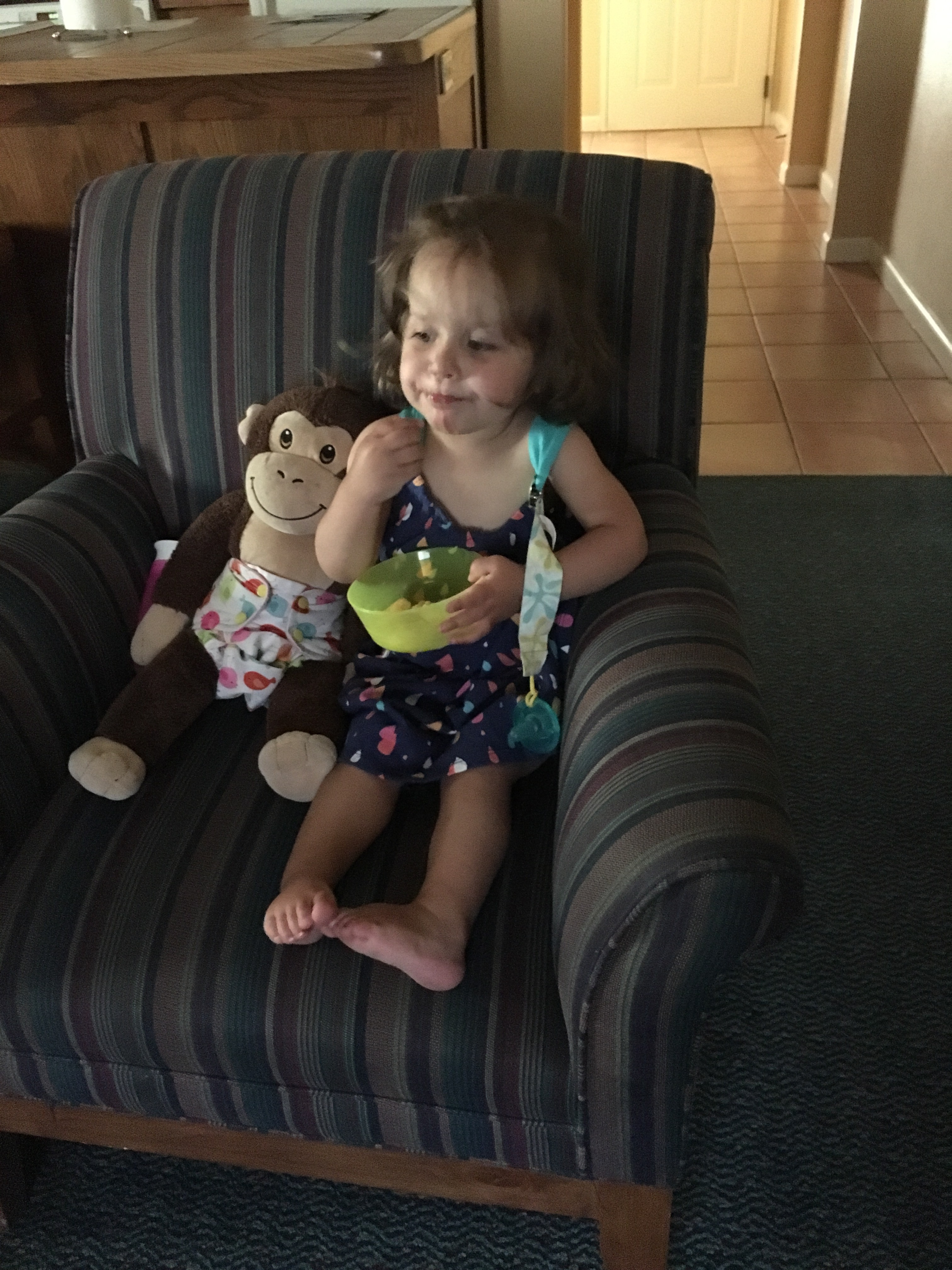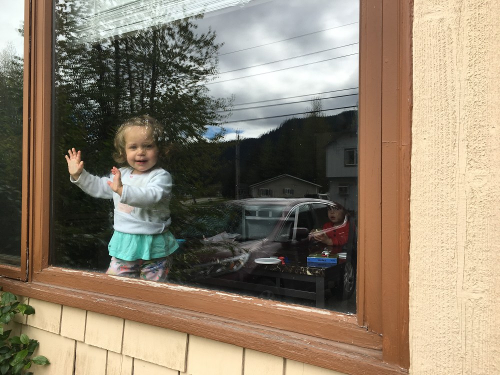 She was showing her monkey out the window. She is very good at including everyone and everything in on the fun!