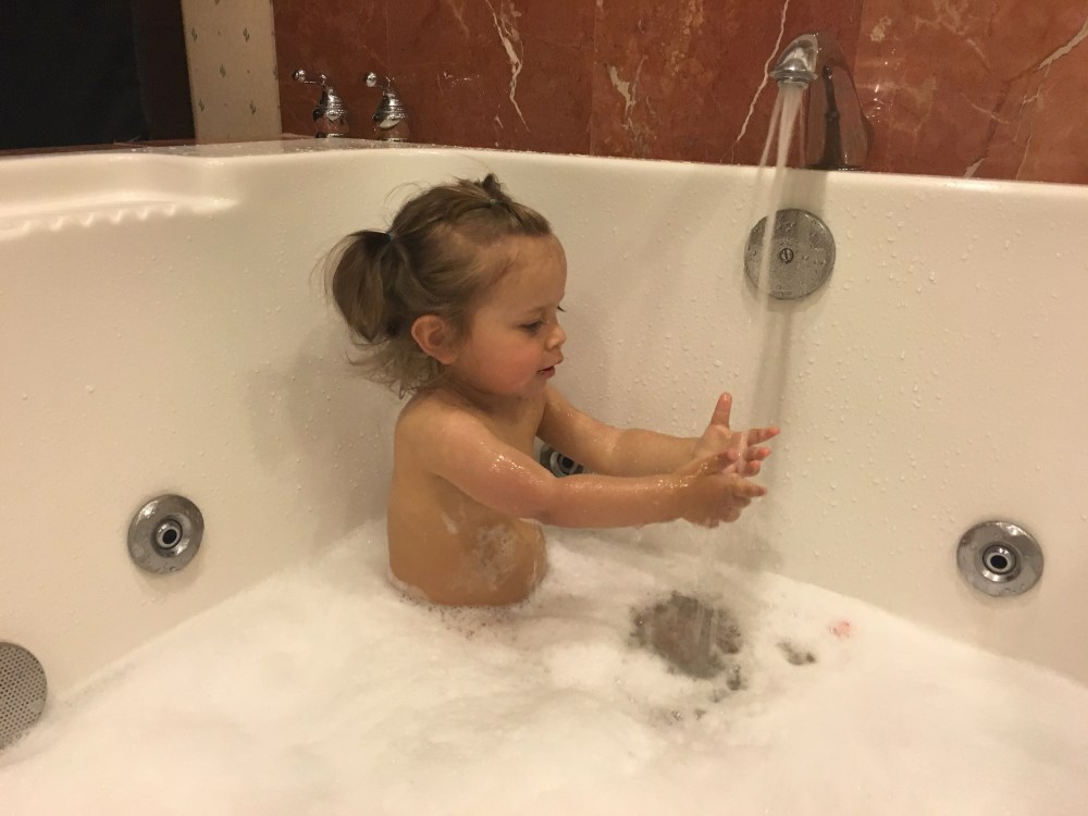 They had a HUGE jacuzzi tub at the hotel and BB got to take a couple baths that were more like swimming. She had a blast!