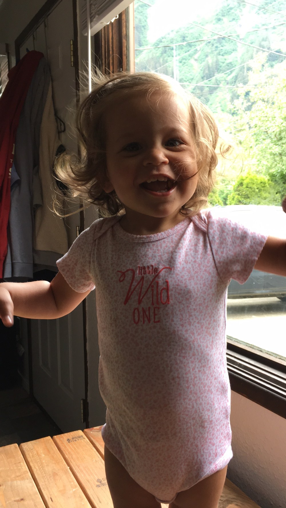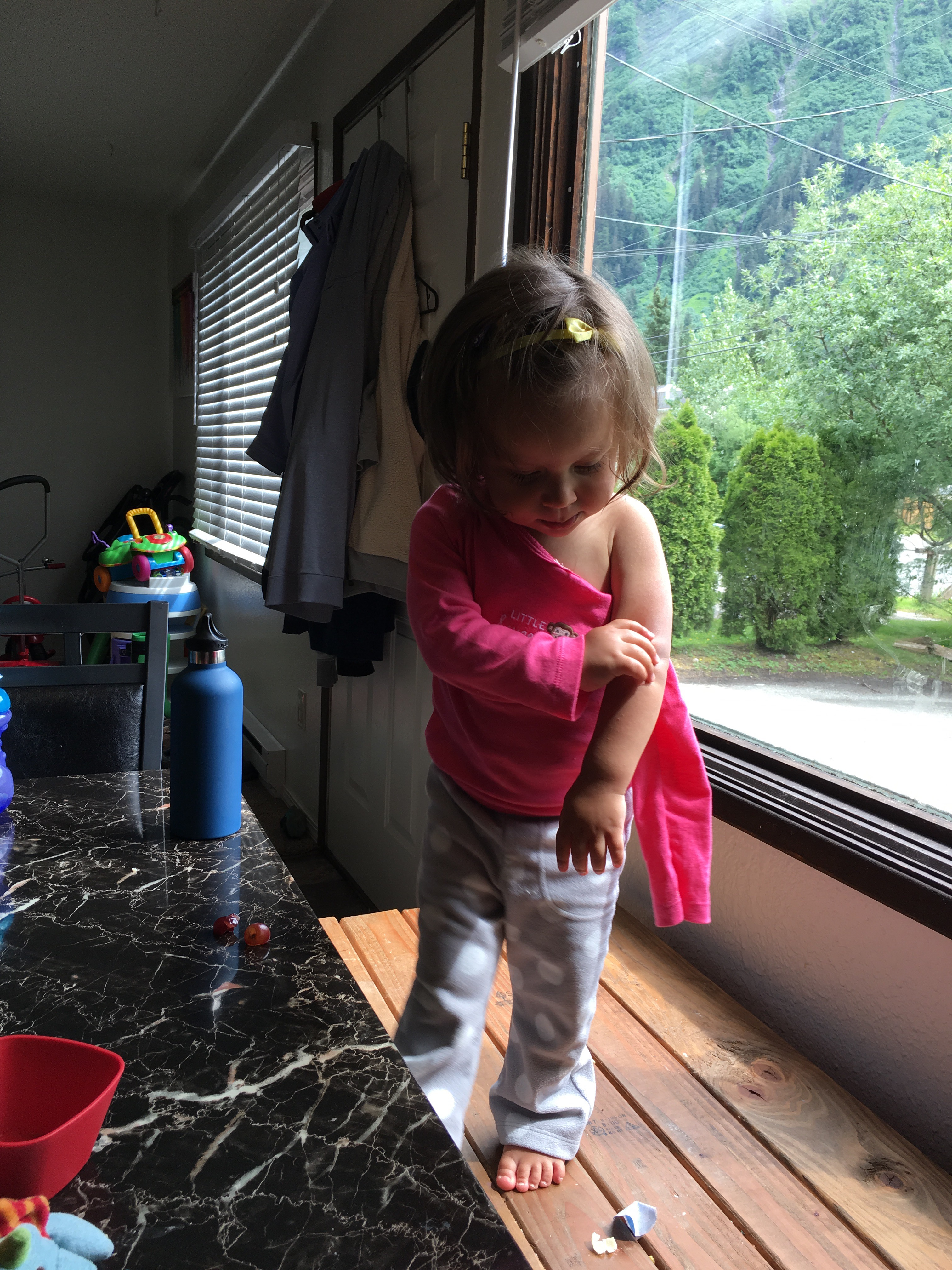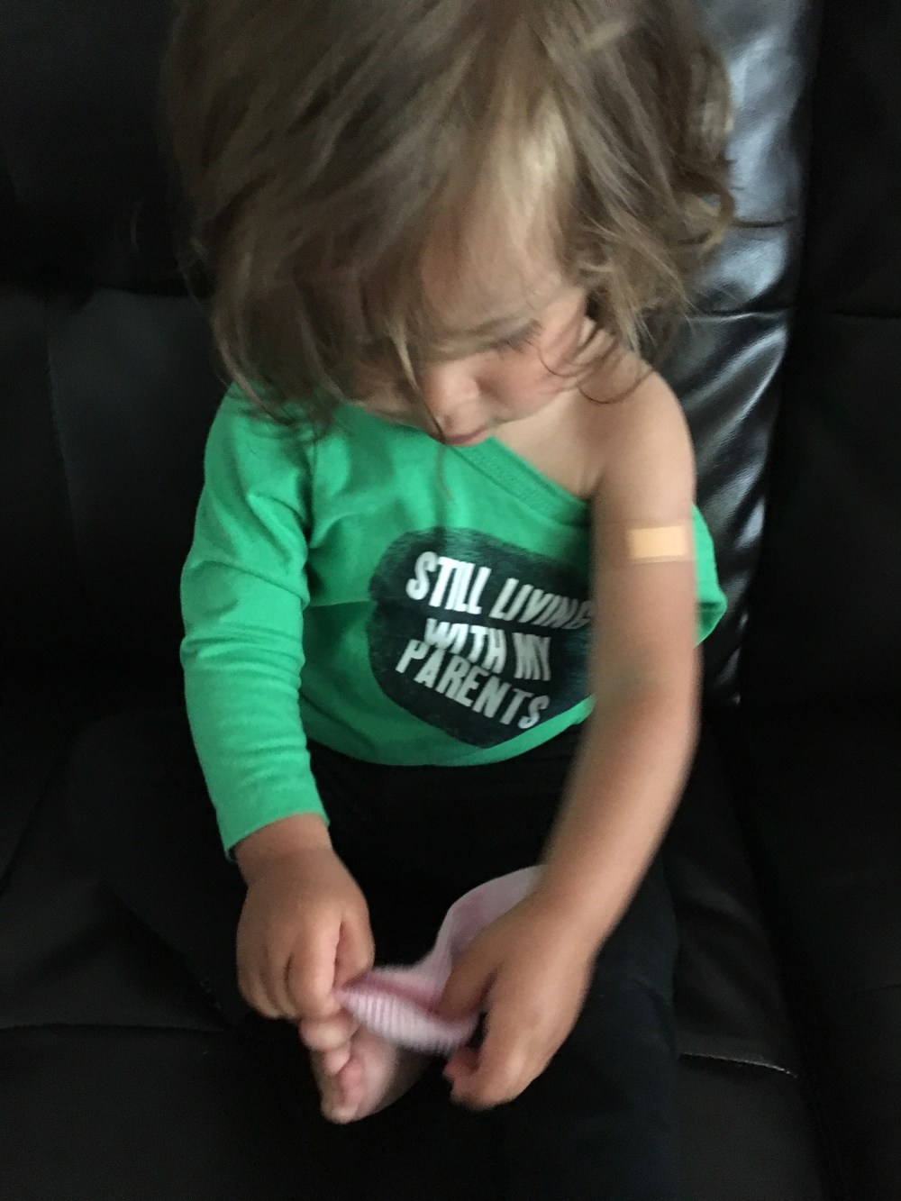 Every chance she got she would take her arm our of her shirt. I don’t understand this desire to wear her shirts wrong but it is quite hilarious. Also she has discovered how cool bandaids are. I have one on my knee and she is fascinated with it. She always wants to touch it and so I finally gave her one of her own that she could poke at. She kept asking for more and eventually peeled it off and was sticking it all over herself.