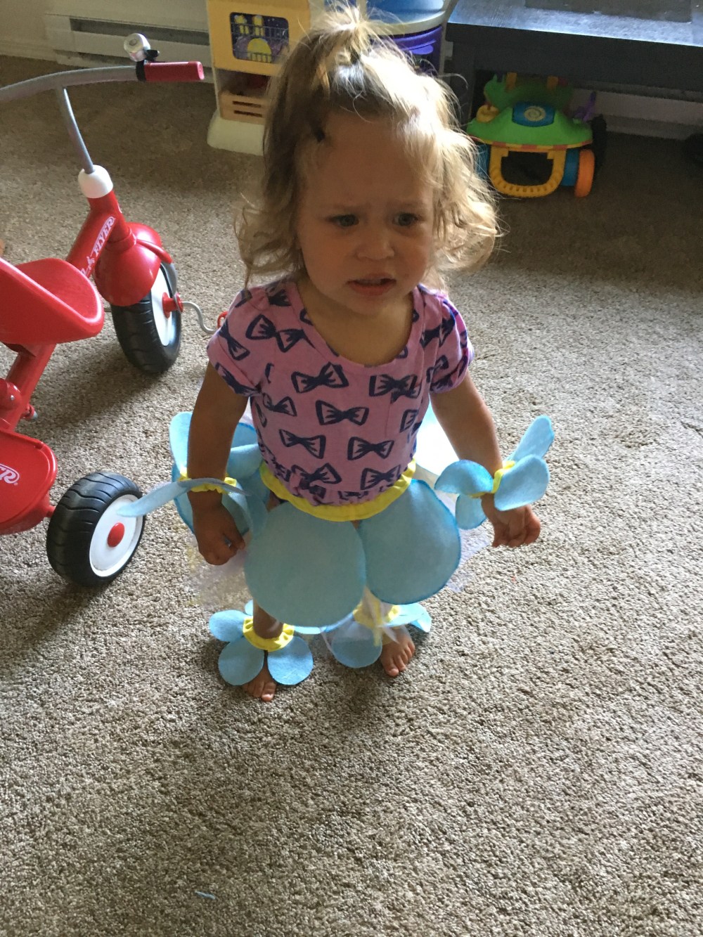 BB has been wearing my flip flops a lot. This time she basically dressed herself and I have a feeling these outfits are going to be a new regular soon! She put a shirt over her PJ’s, a cape, one of my socks, and flip flops…. she’s going to start a new fashion trend among the toddlers!
