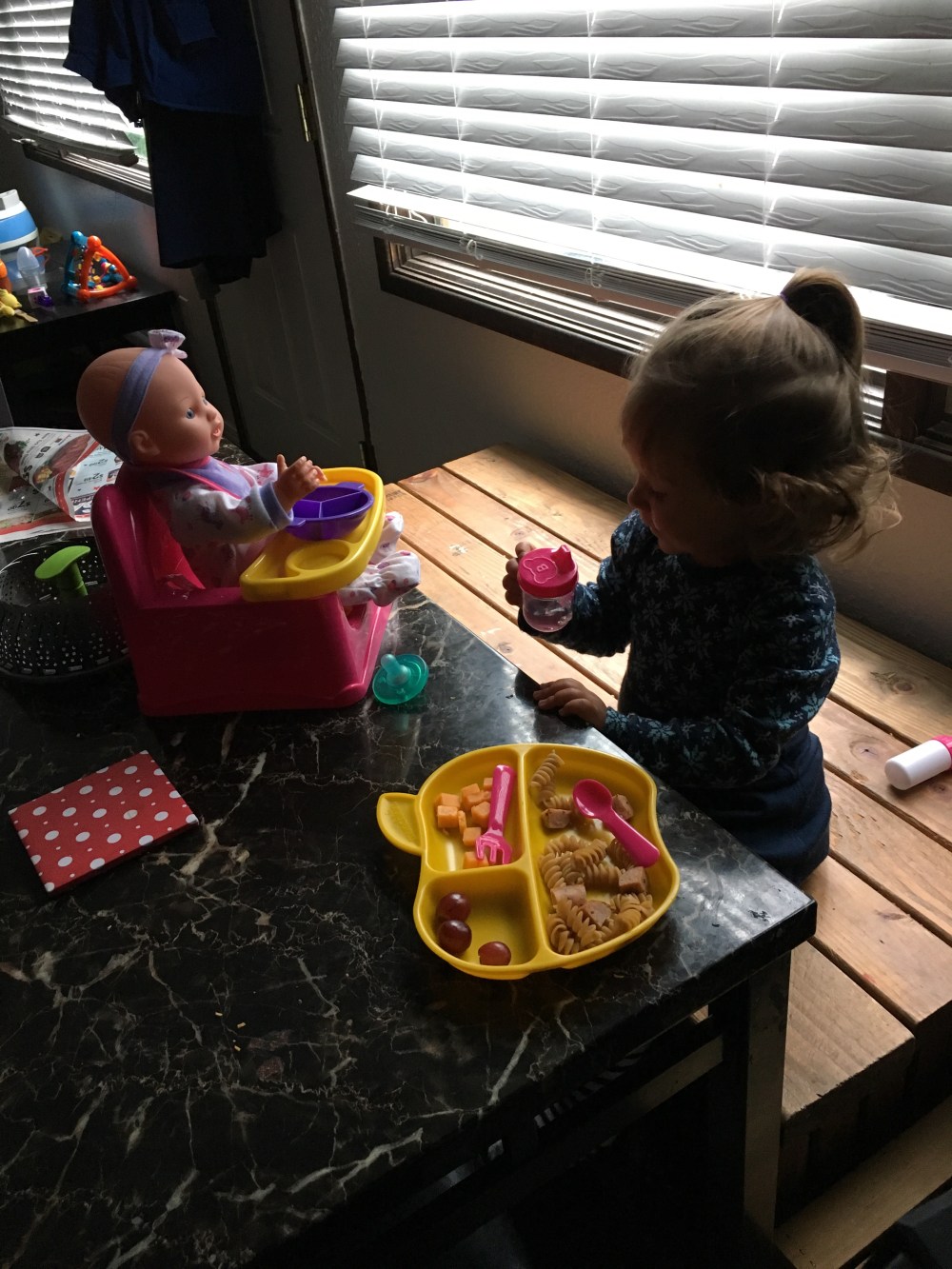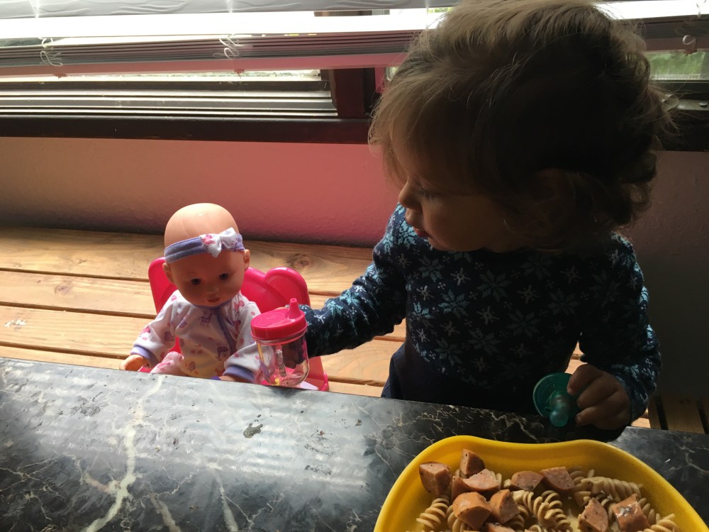 BB has shown a great interest in babies and taking care of dolls or stuffed animals so we got her first doll and she has loved it! Although I think she takes babysitting a little too literally!!