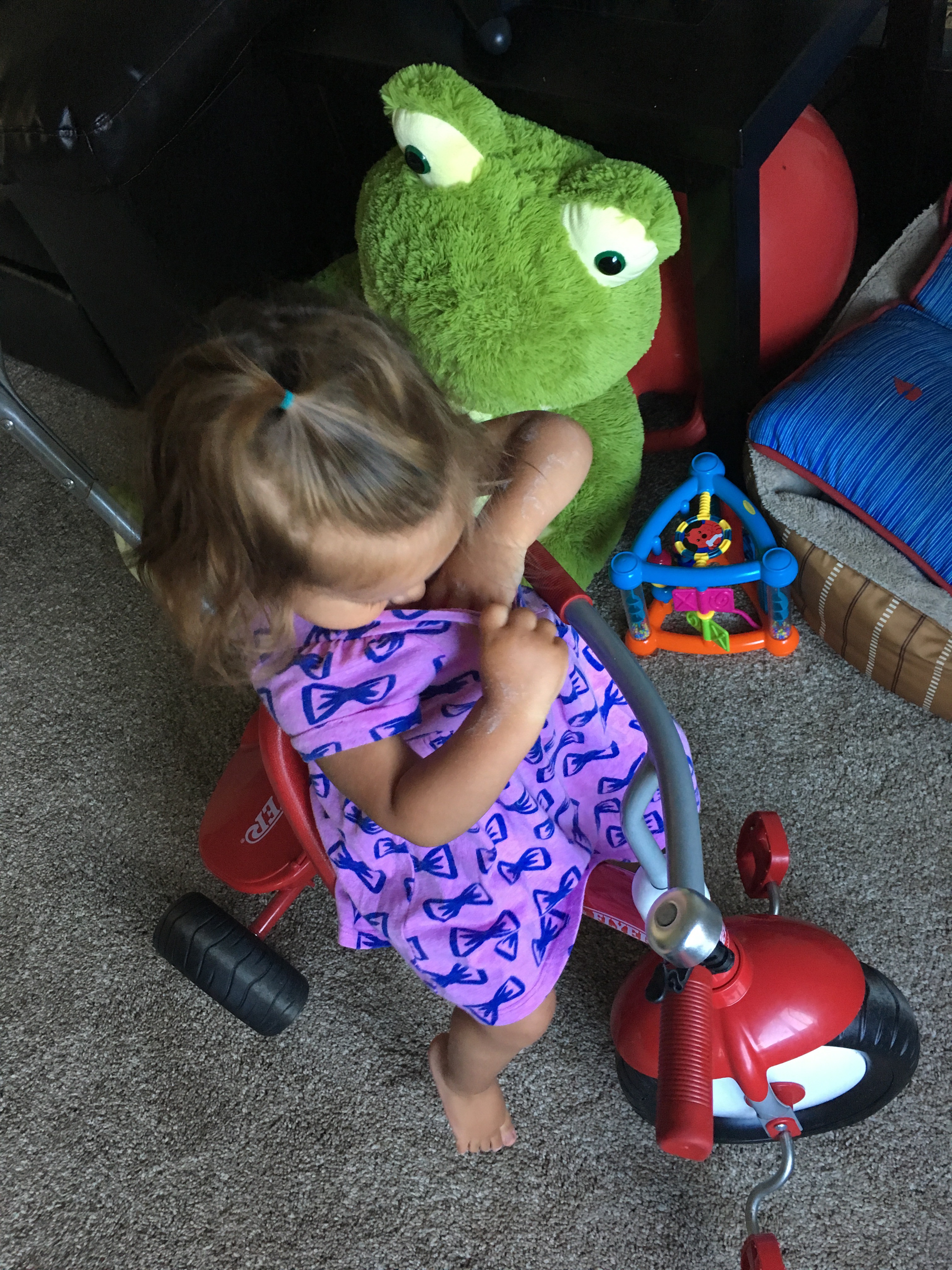 Lately BB has been putting everything in her shirt. Here she was getting really frustrated because they ball she was putting in her dress kept falling out the bottom. We ended up going for our entire walk with four different balls in her shirt… I choose my battles.