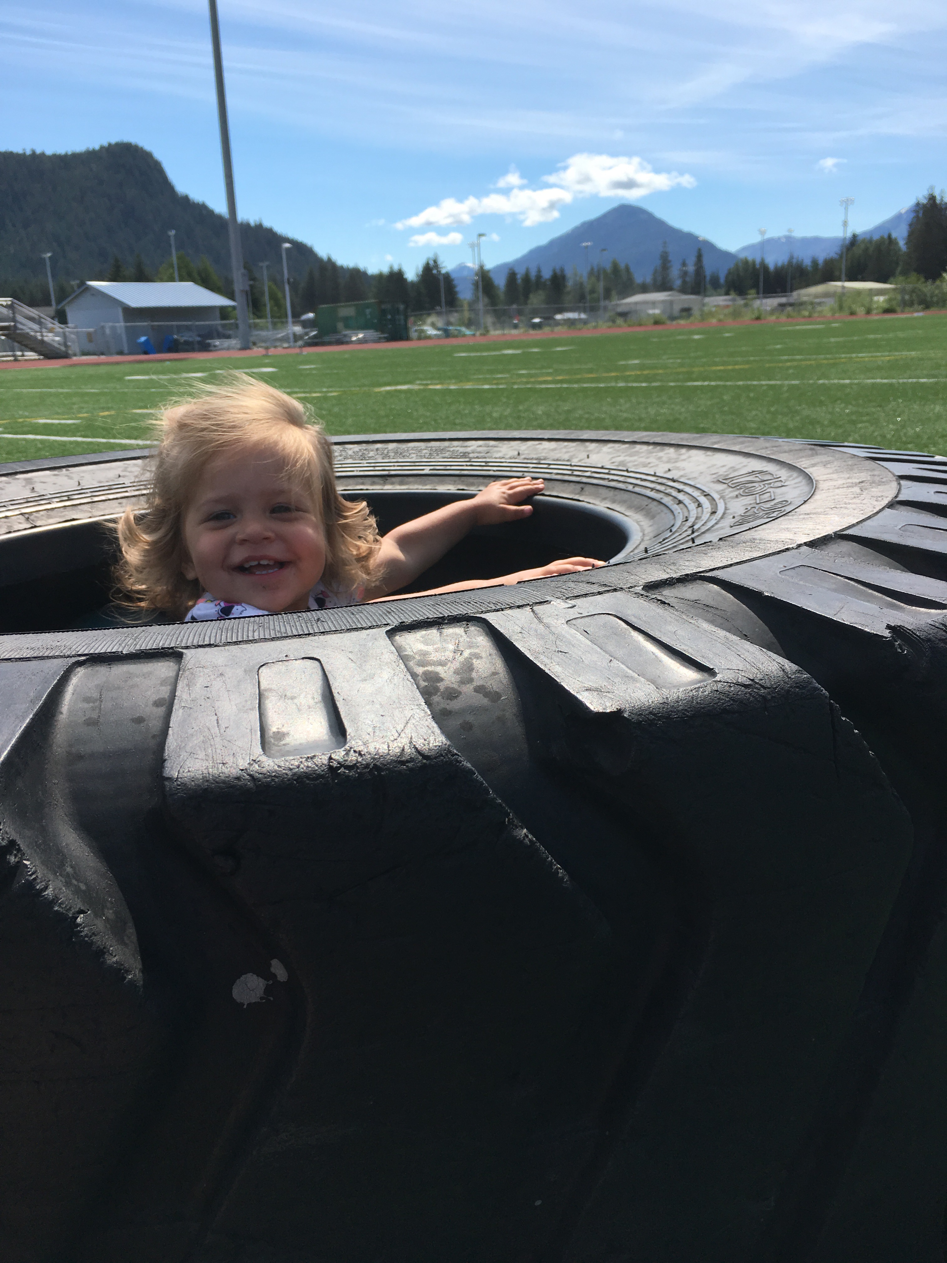 We found a gem of a play area, the turf football field at the high school. There are huge tires that when I get crazy I move for them and then just open space to run. We bring balls and basically just let the kids run wild. They have a blast!