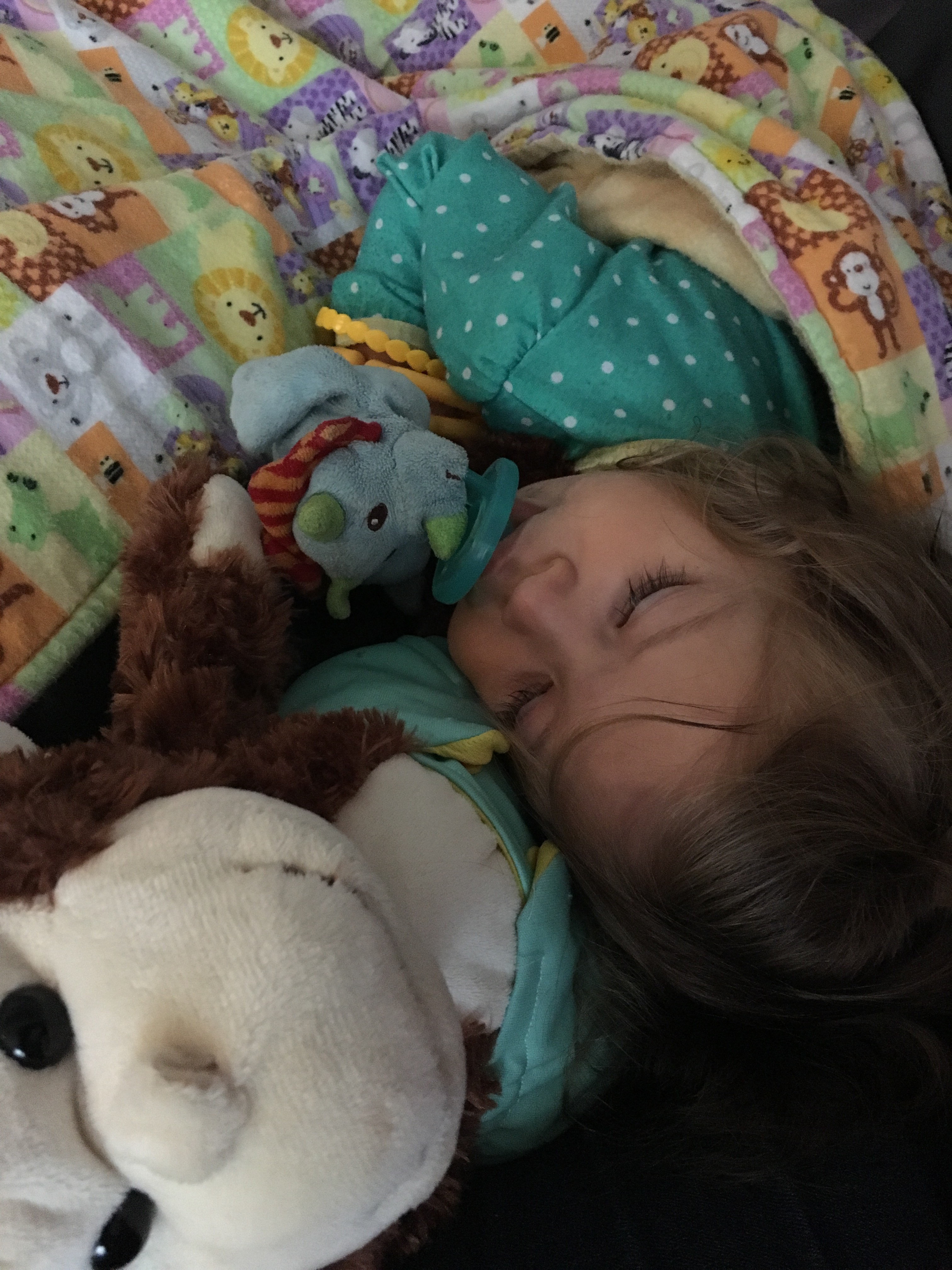 BB caught pink eye this last week. She was doing really well handling it and only really seemed bugged when I would try and clean her eye. However, the morning after her doctors appointment (which she totally rocked!) she was so cuddly and I caught her using her stuffed animal as a pillow while watching a movie. I am not sure if she was just taking advantage of our inability to really go anywhere for 24 hours but she totally soaked up the extra cuddle time!