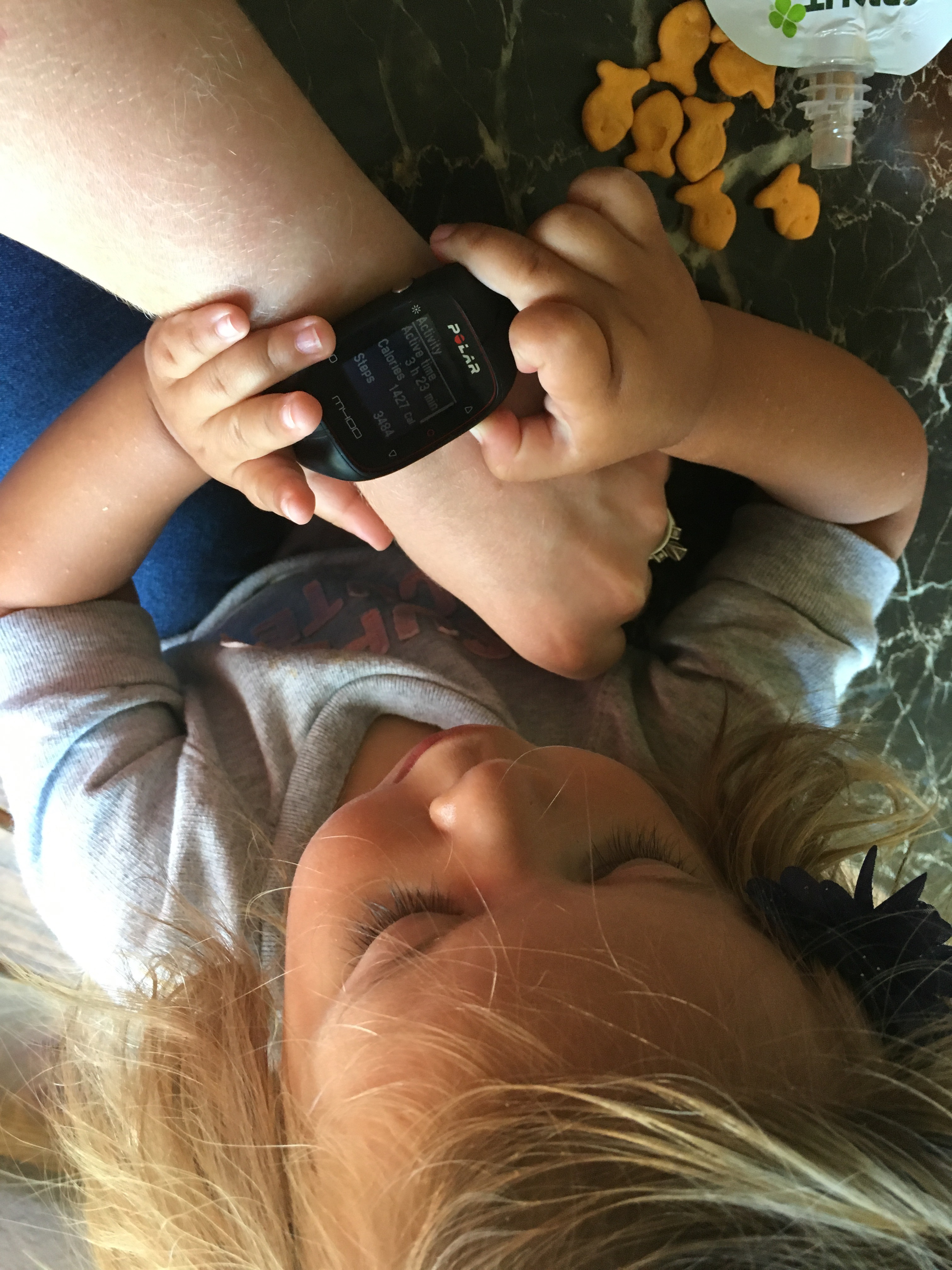 When we were on our trip as a means of distraction and entertainment I showed BB how to work my fancy watch. If you go to the right screen it will show you a man running, walking, and standing. It’s BB’s favorite thing to do.