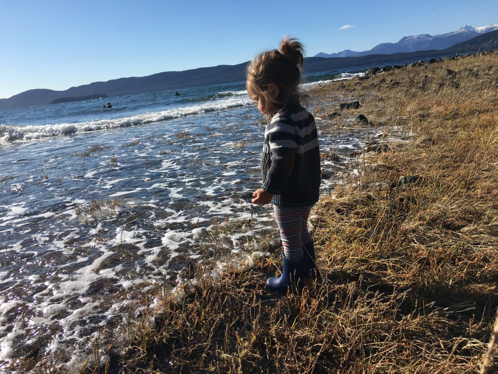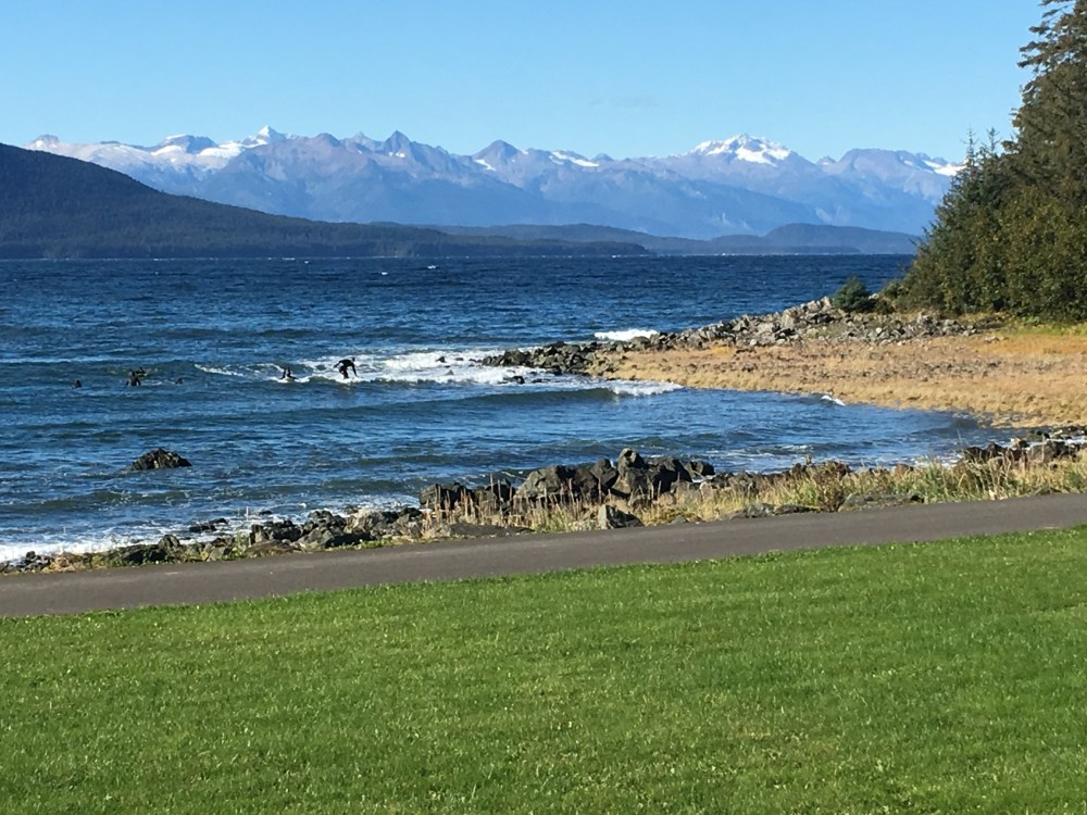 We went and visited daddy at work. He was filming the opening mass for a Catholic conference out at the Shrine and there was a group of people surfing!! Yes, people surf in Alaska! I’ve never seen wave like they were here today!