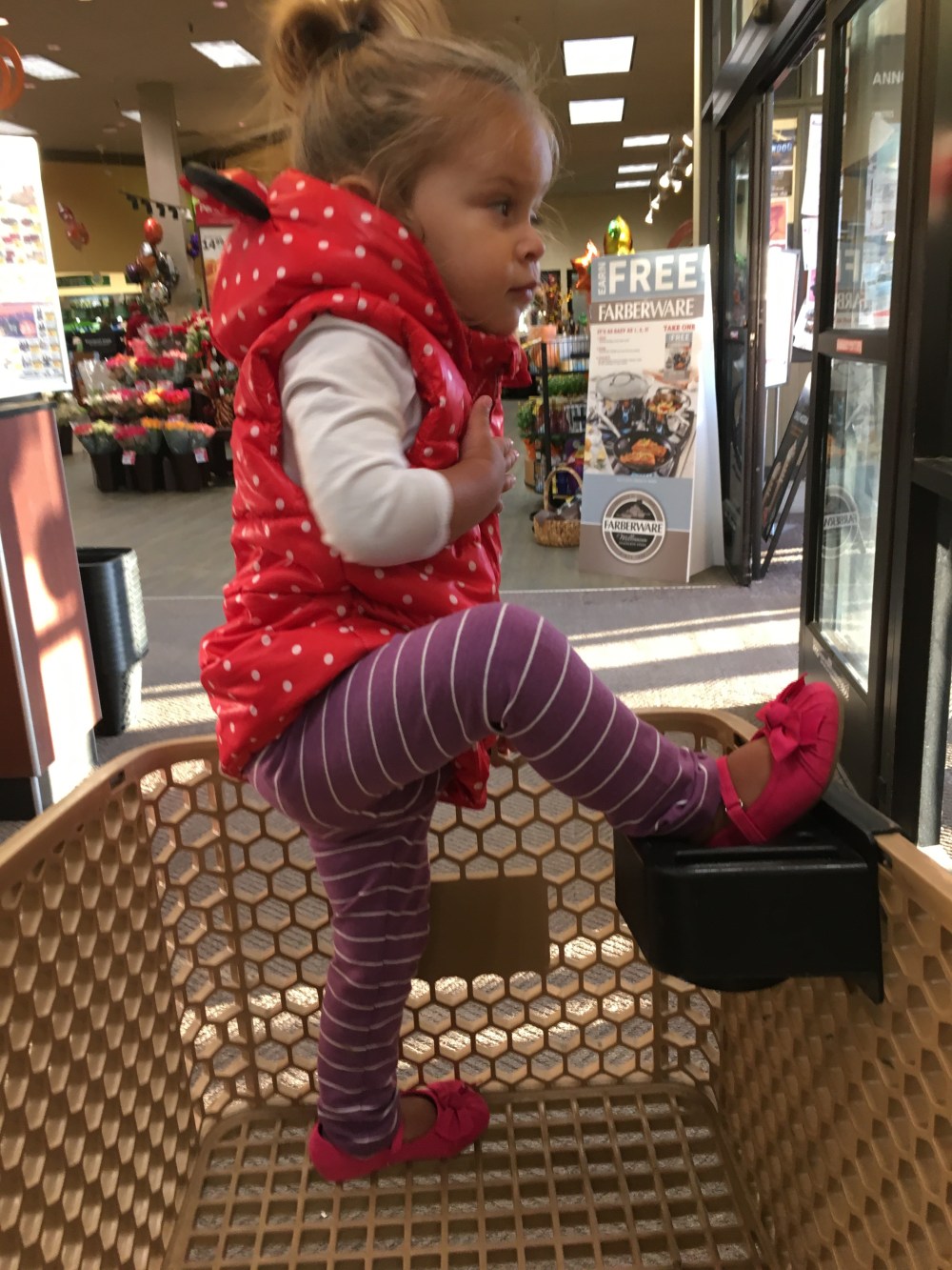 BB is going to be a gymnast or ballerina someday I can just tell. She was stretching/standing in the shopping cart the other day. Yes, I realize this is dangerous and D would not approve but it was only for a few seconds before I asked her to sit back down. Sometimes you just have to live life on the edge! Also, fun story about those pink girly shoes, she picked them and insisted she had to have them! They were on clearance and she needed church shoes but I thought it was so funny that she just had to have the pink shoes!