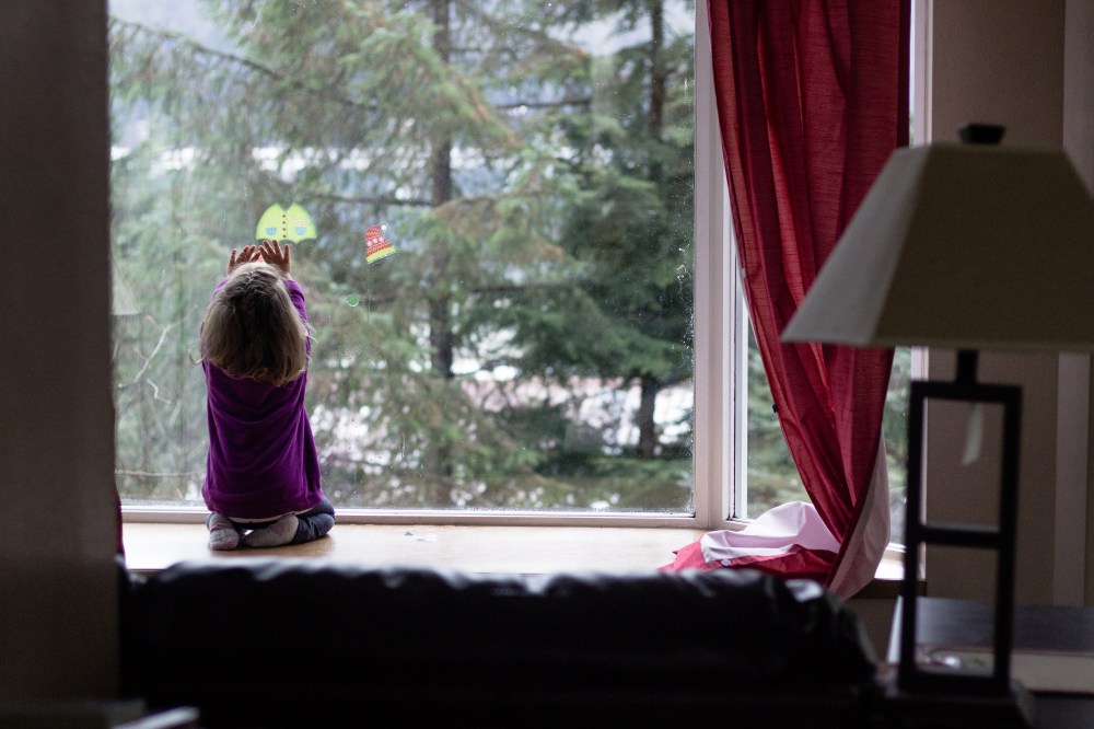 BB quietly playing. These window stickers keep her busy for hours!