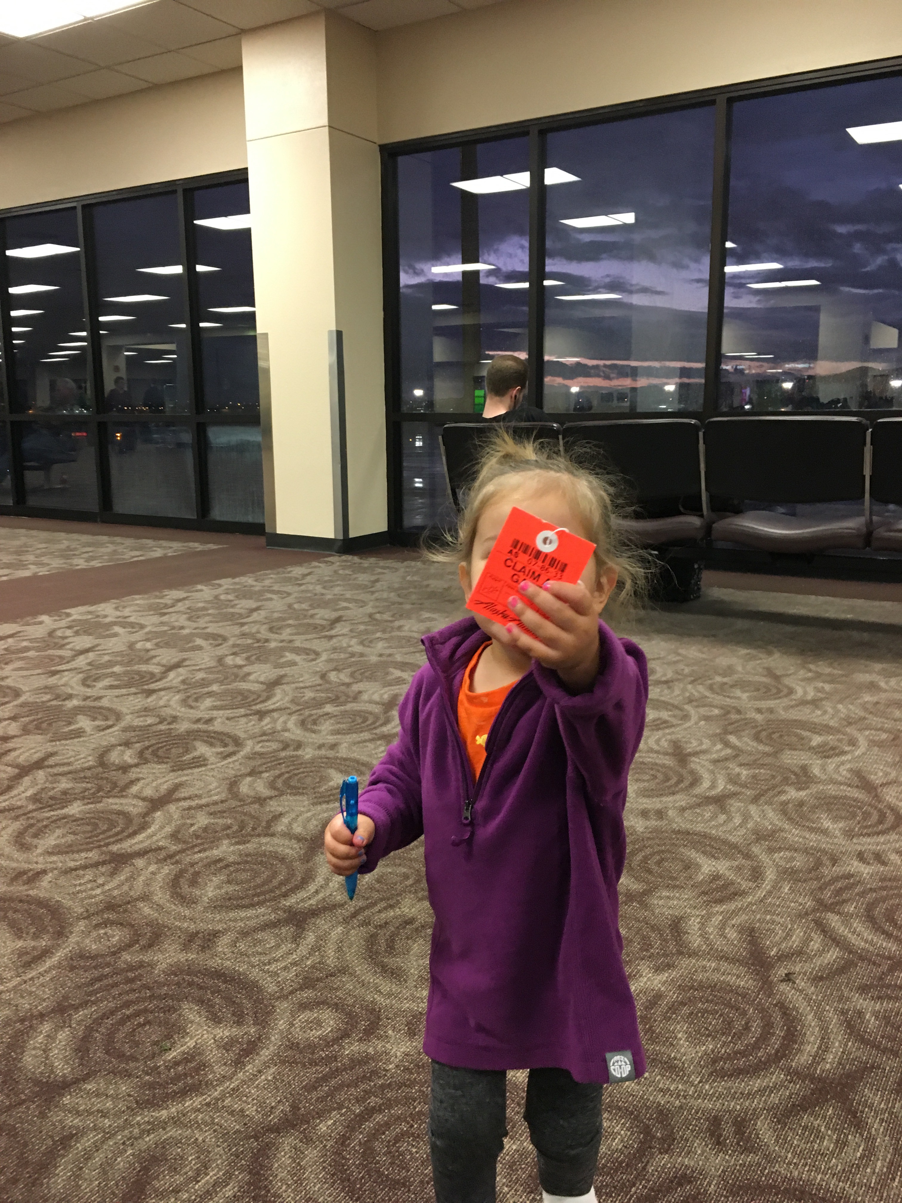 BB was drawing us pictures on her old gate check tag. She was such a bundle of energy while D and I were still waking up!