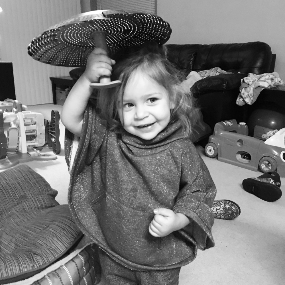 This kid is the best! She was running around saying “tut tut it looks like rain!” Vegetable steaming baskets only make good umbrellas when you’re inside!