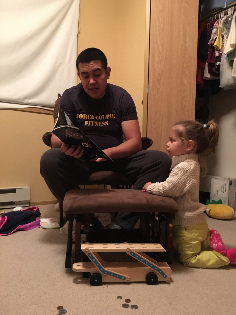 This is my favorite time of the night. He is the best at reading books!! And she loves it! She likes to lay on the foot rest of her glider and rock holding her feet up while he reads.