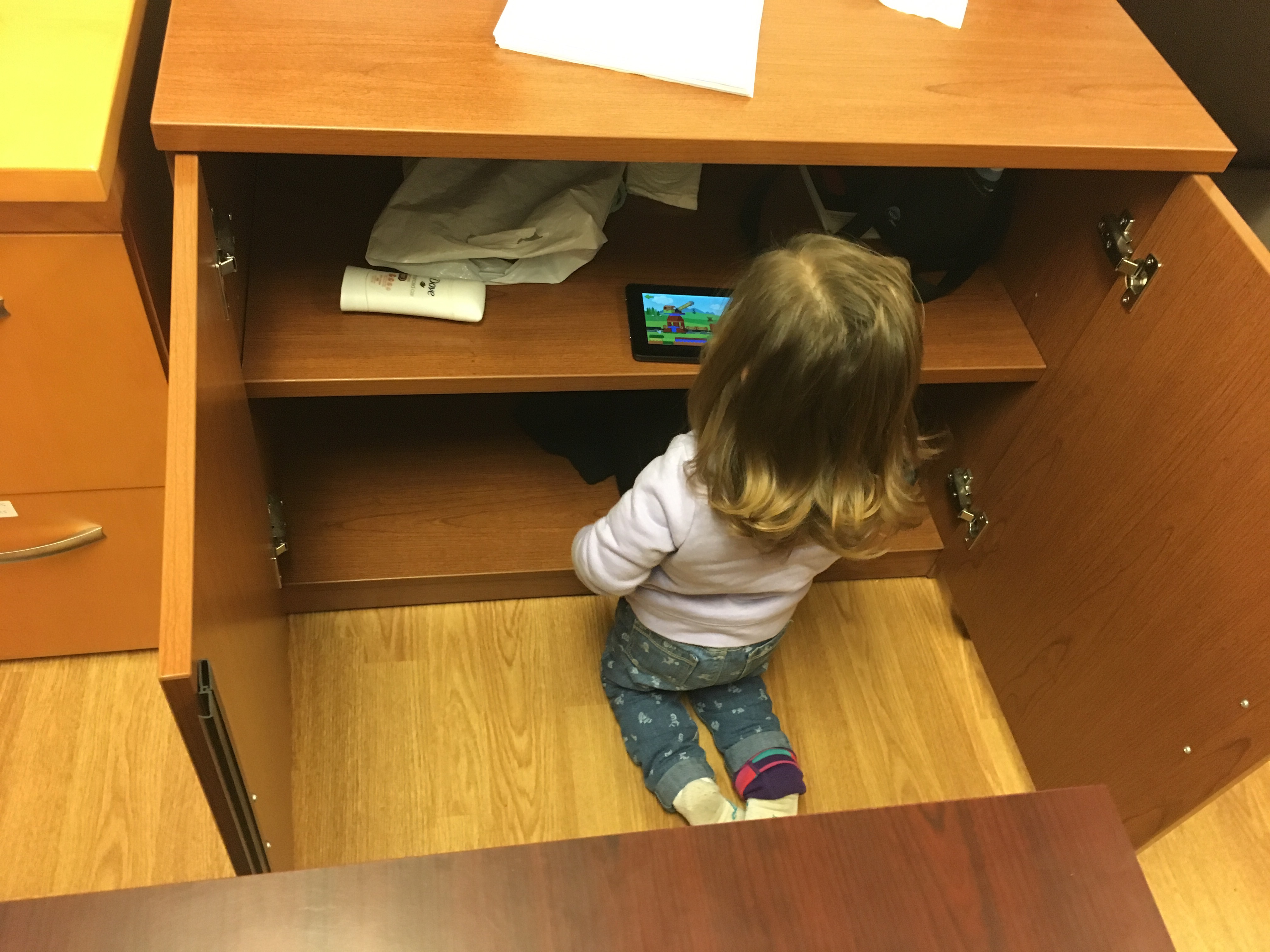 After “school” BB comes to my work with me for about an hour. Sometimes she gets to play games or watch shows. Occasionally she hangs out in the cabinet to watch them!