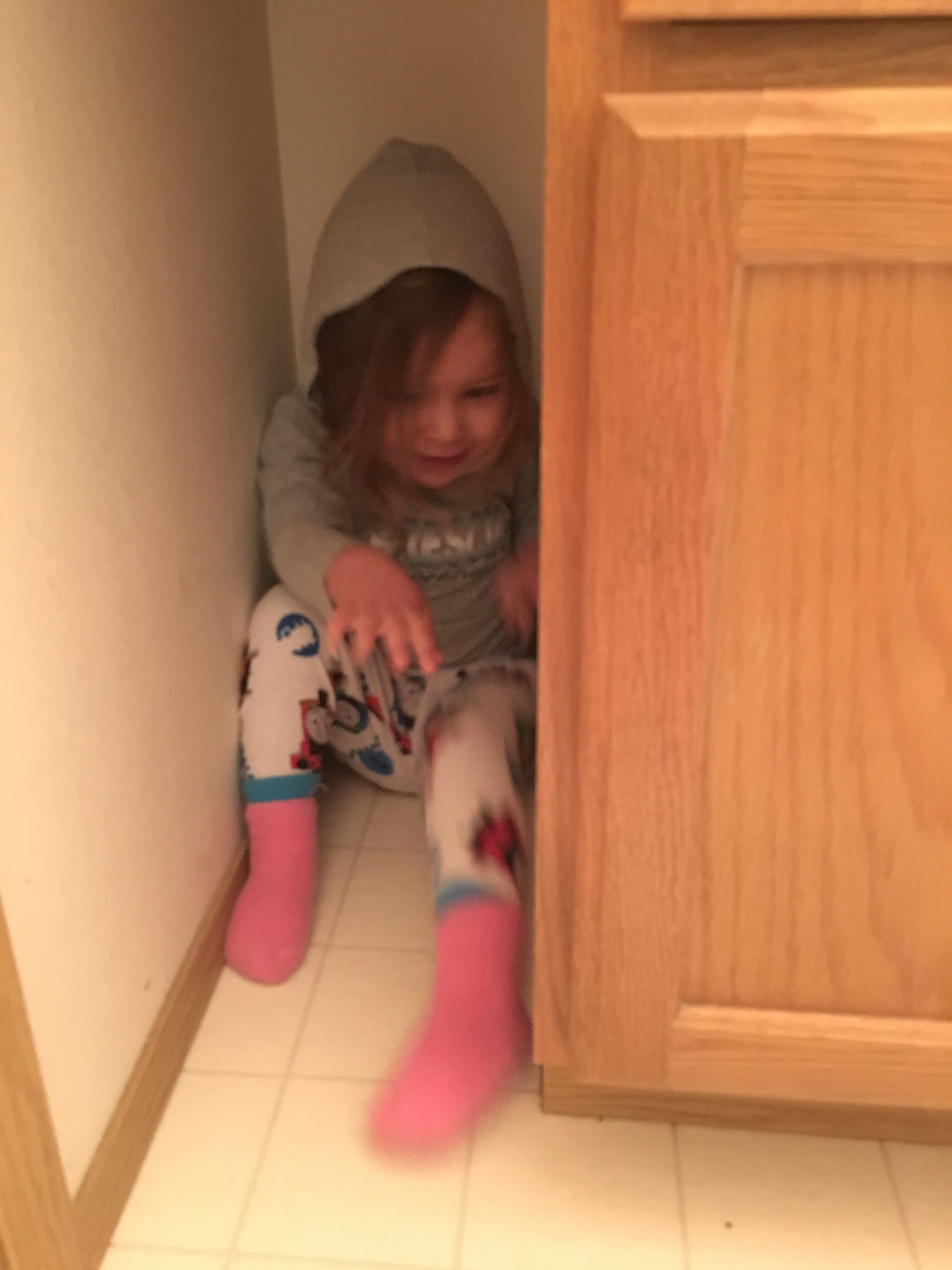 We have this really odd hole under the bathroom sink and BB loves to crawl in and hide. However, she must have grown because she didn’t fit as well this time!