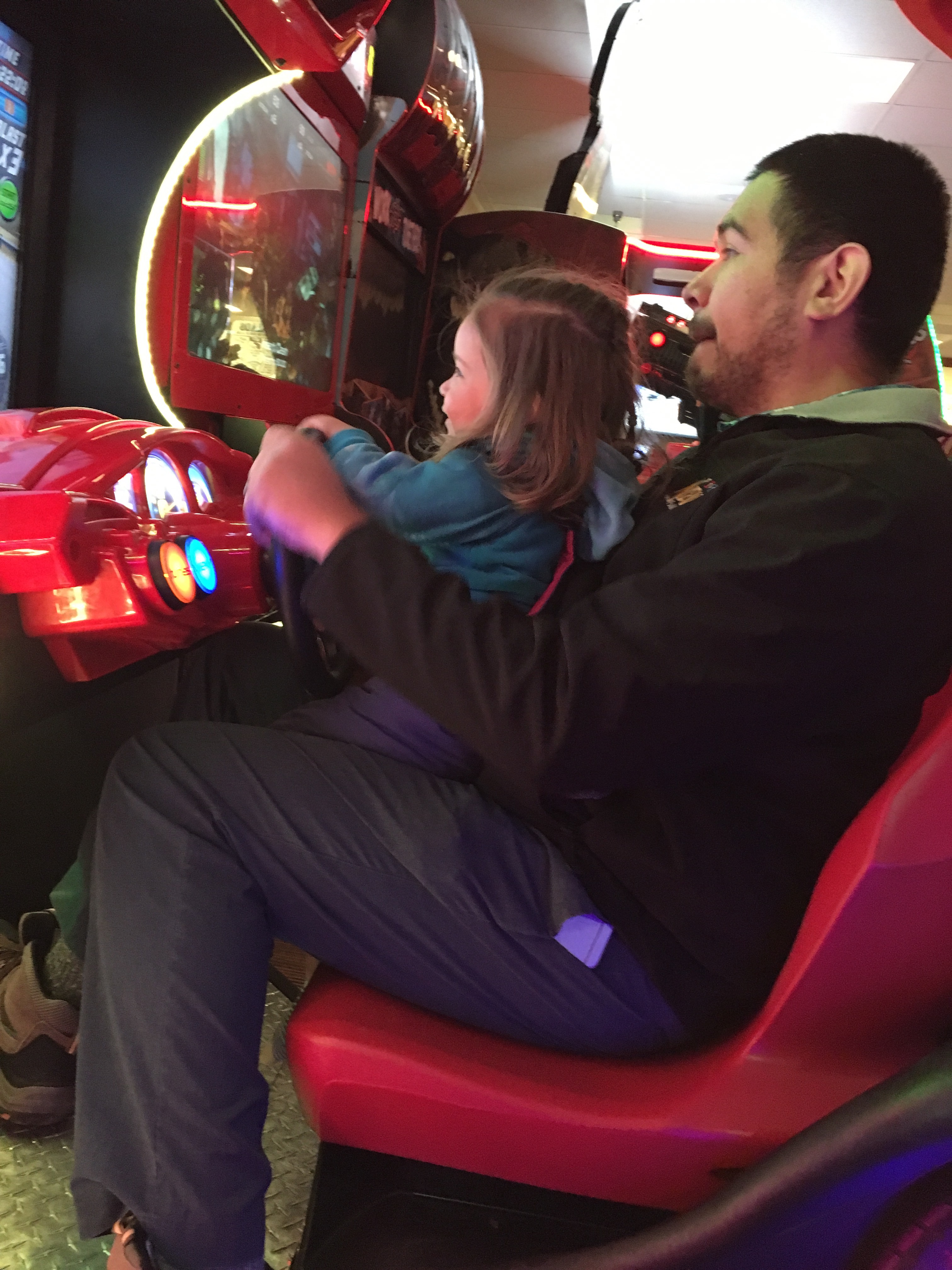 There is a local pizza place that we go to often that has arcade type games and BB and D love to play every time! It was so cute watching them play this racing game. BB was having the time of her life!