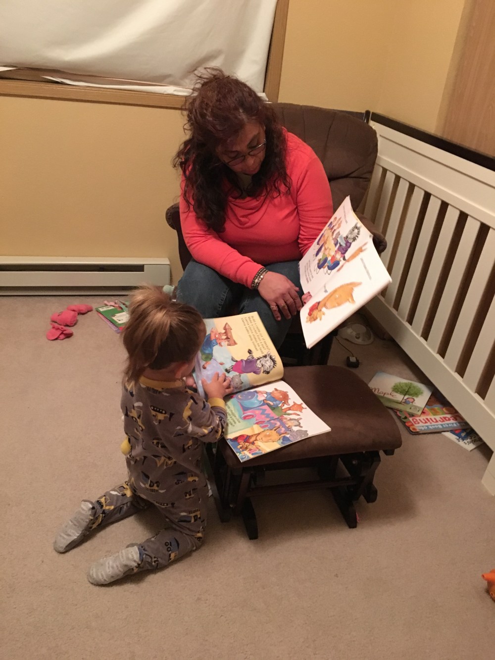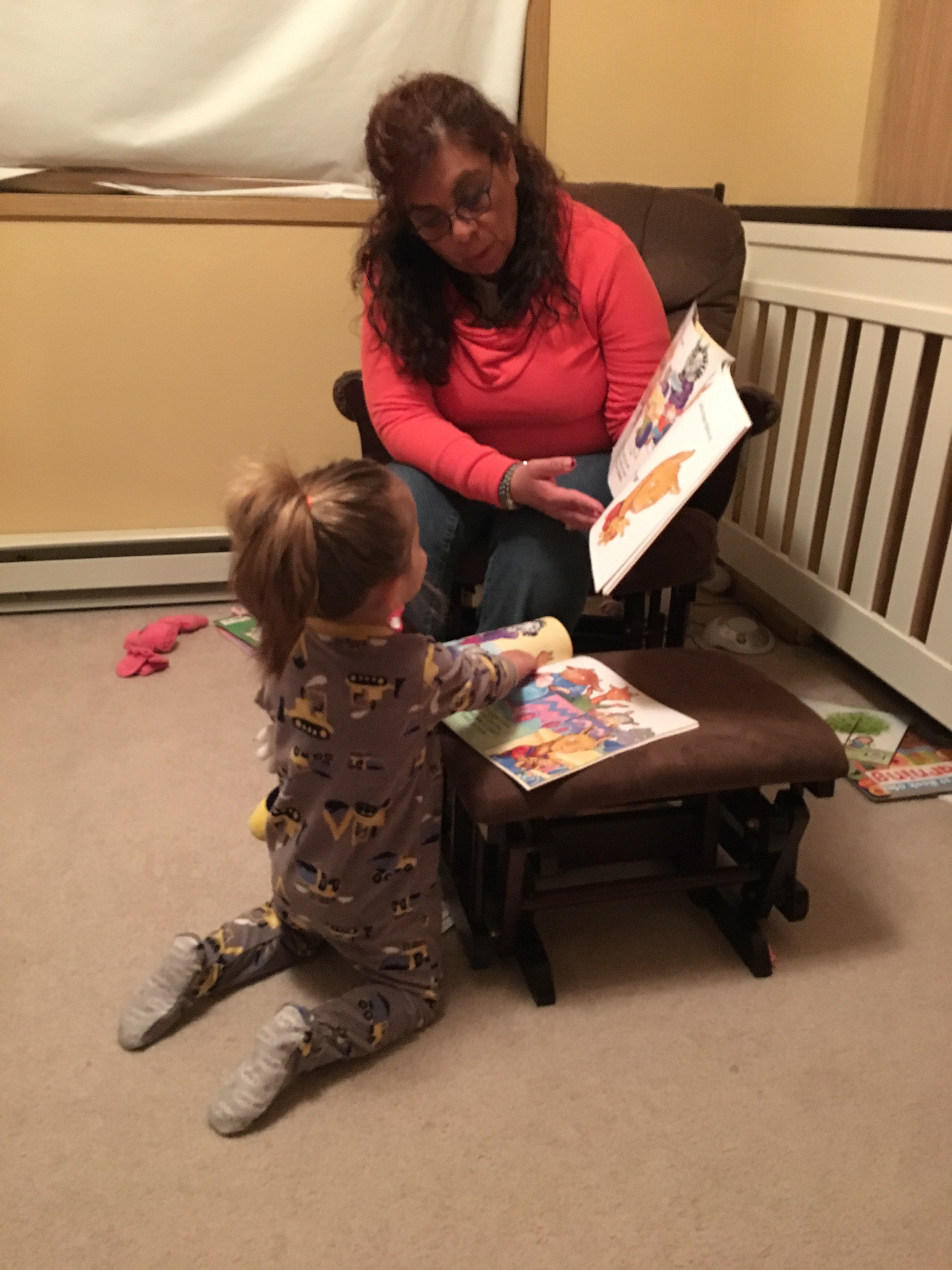 This evening Nana was reading her bed time story and BB was following along in her own book. It was so stinking cute to see her acting so grown up!!