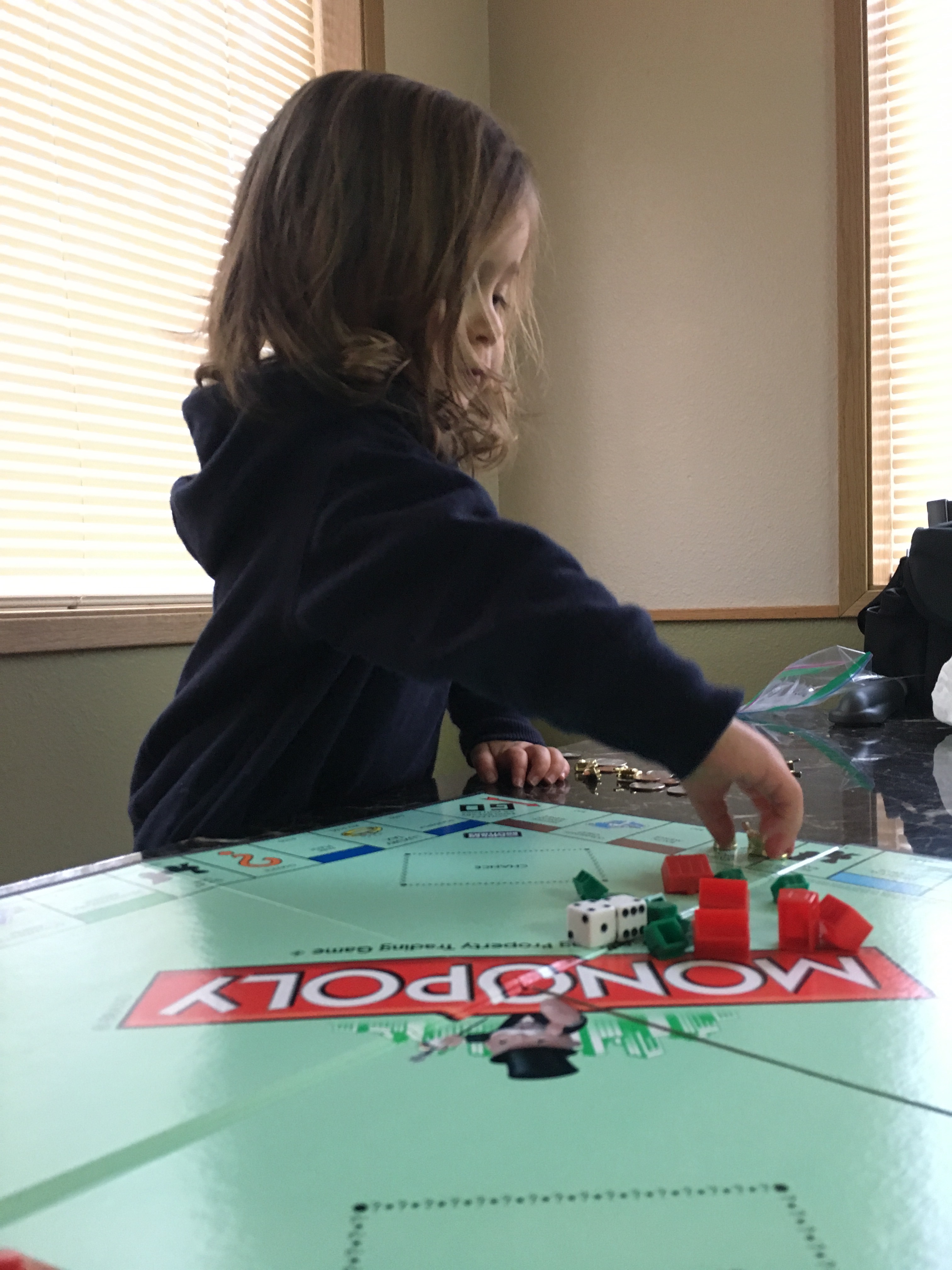 While D’s parents were here we played monopoly during BB’s naps and BB would always join toward the end. Well that was enough to get her hooked! She loves playing board games! Before her Nana and Tata left they got her hungry hungry hippos and we’ve been playing that every chance we can! BB was so cute while playing one afternoon with her Nana and Tata, she was taking all the money from the “bank” and saying I’m a bank robber! I’m robbing the bank!