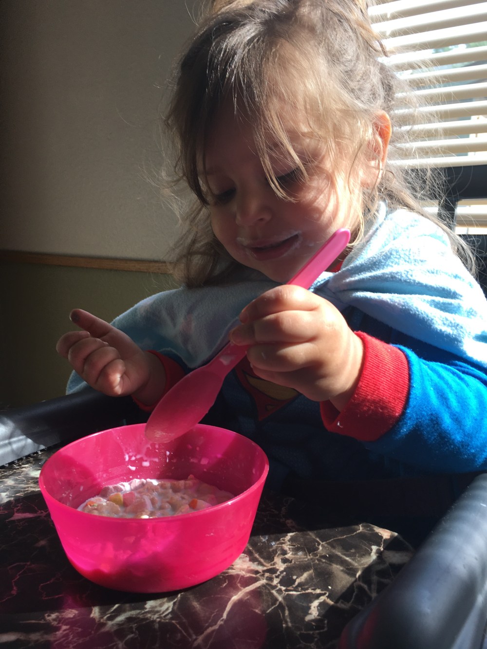 Because D and I felt bad that BB thought cereal meant only Cheerio’s we thought we would broaden her horizons and gave her lucky charms!