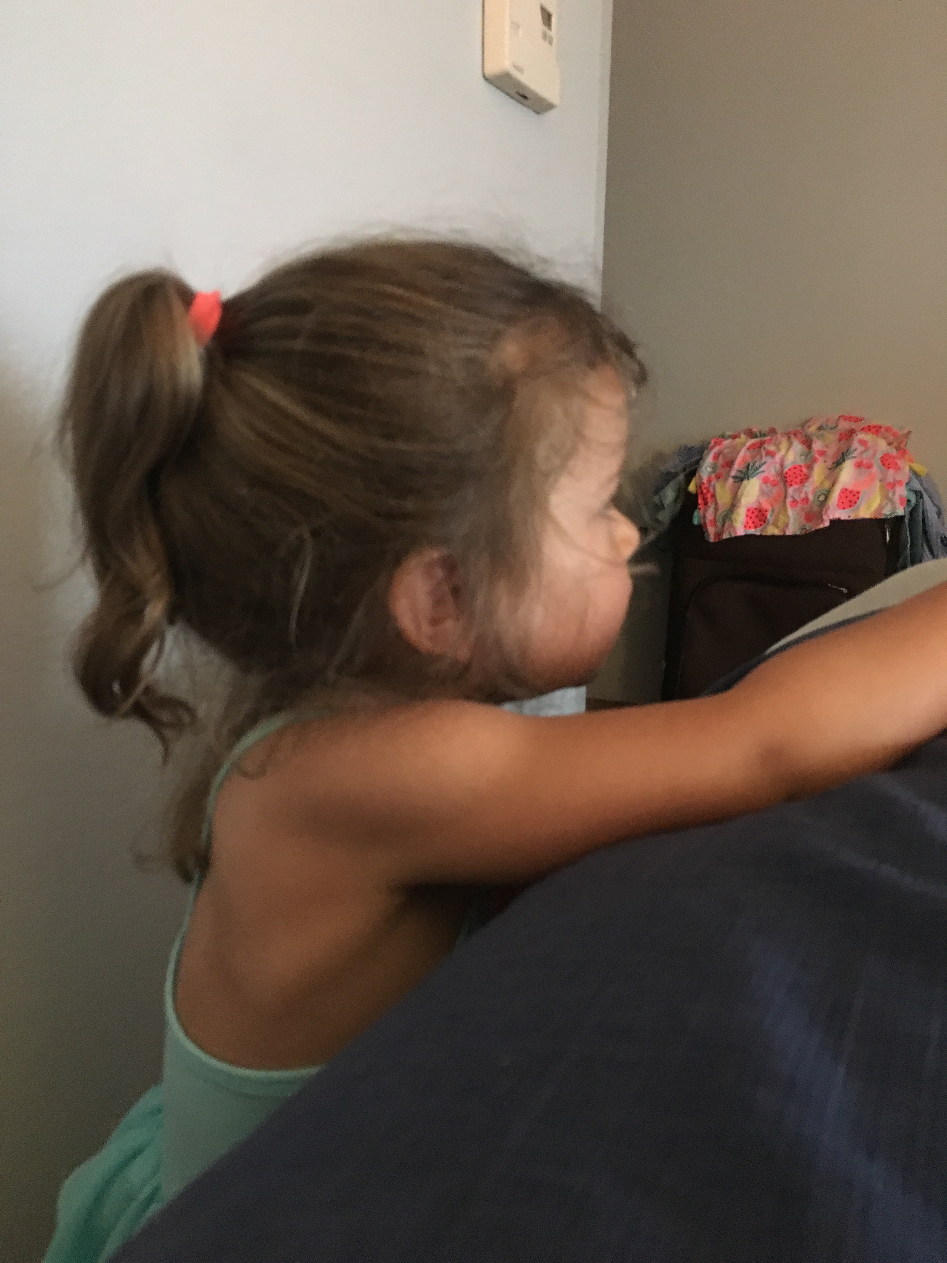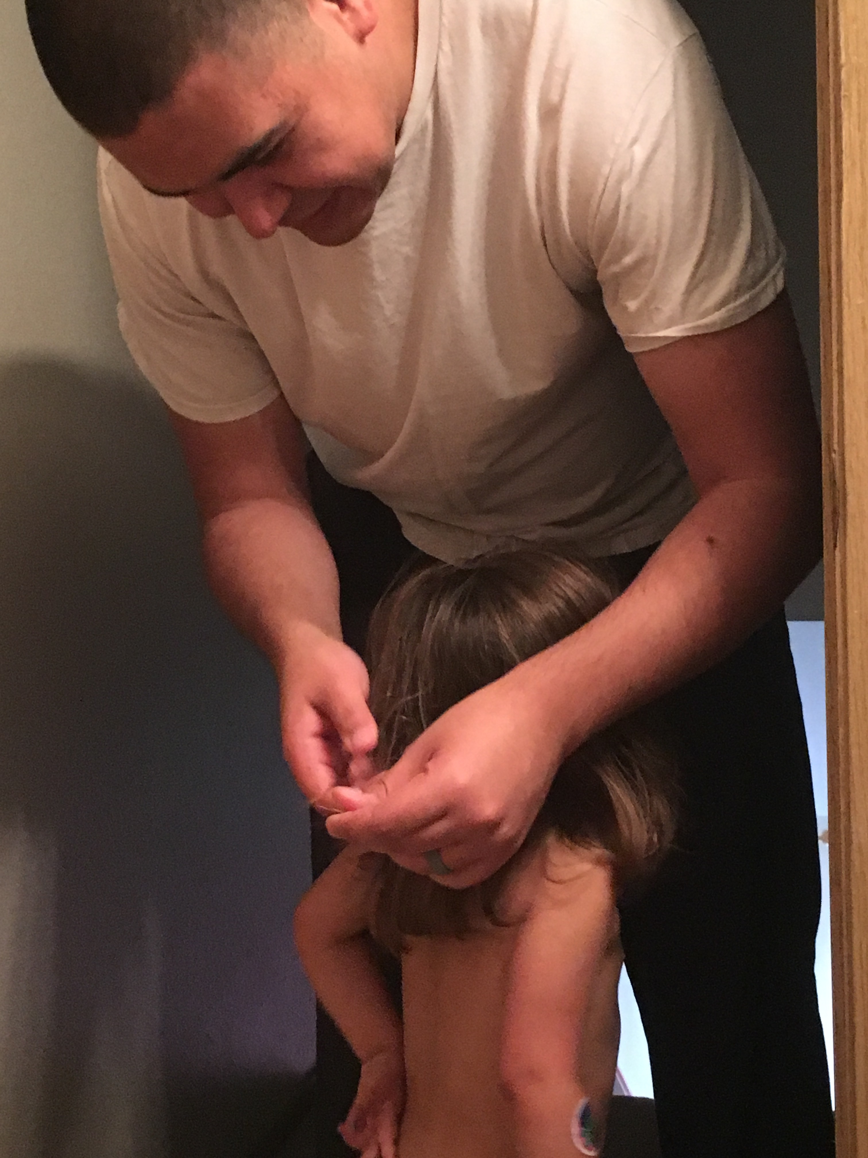 When we rally the troops to get BB in the shower, sometimes mom is busy, or soaking wet in the shower and dad is stuck taking tricky hair ties out! Now that I think about it I’m not sure how this photo happened….