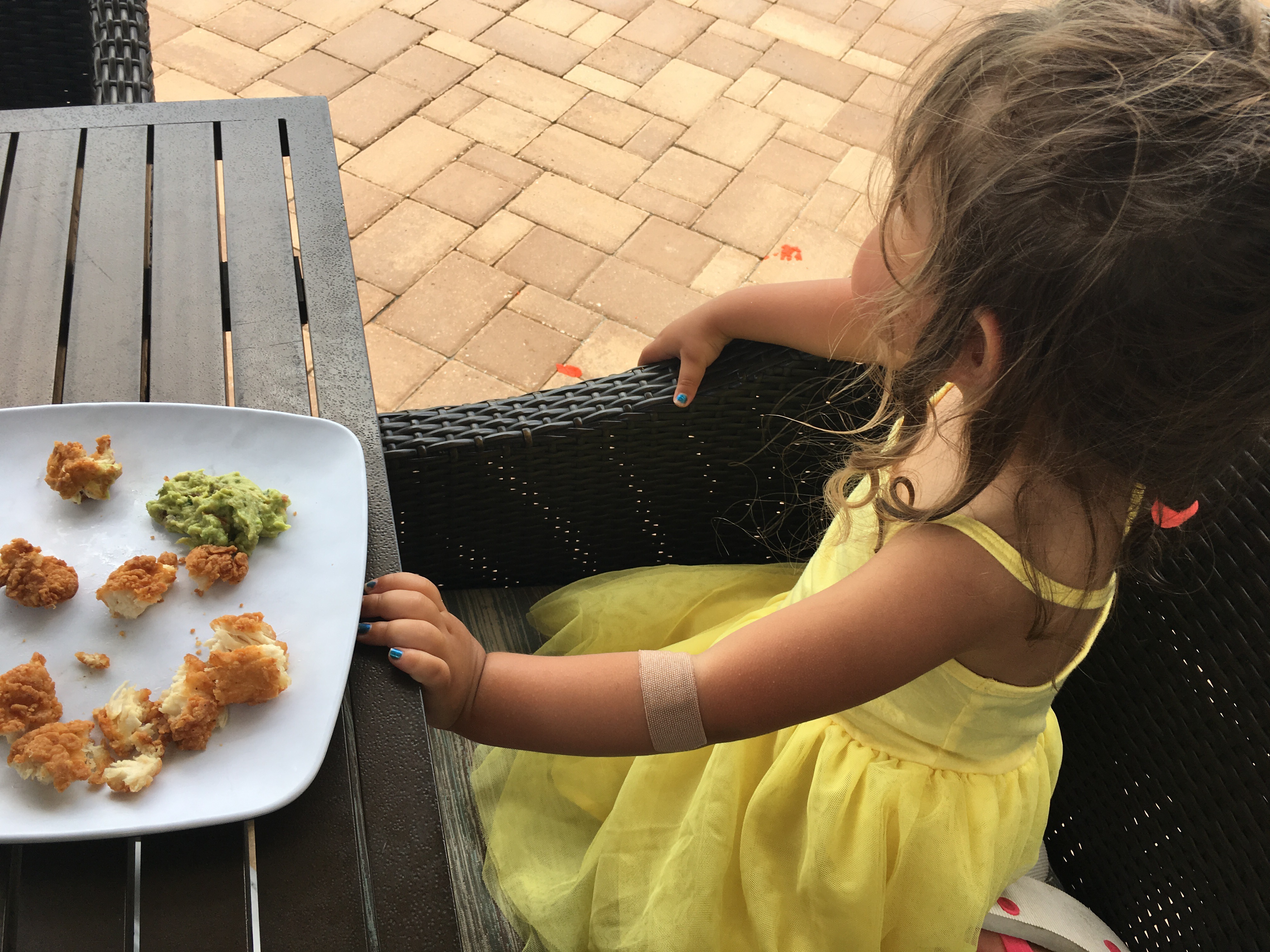 Who needs ketchup, she’s got guac to dip her chicken in.