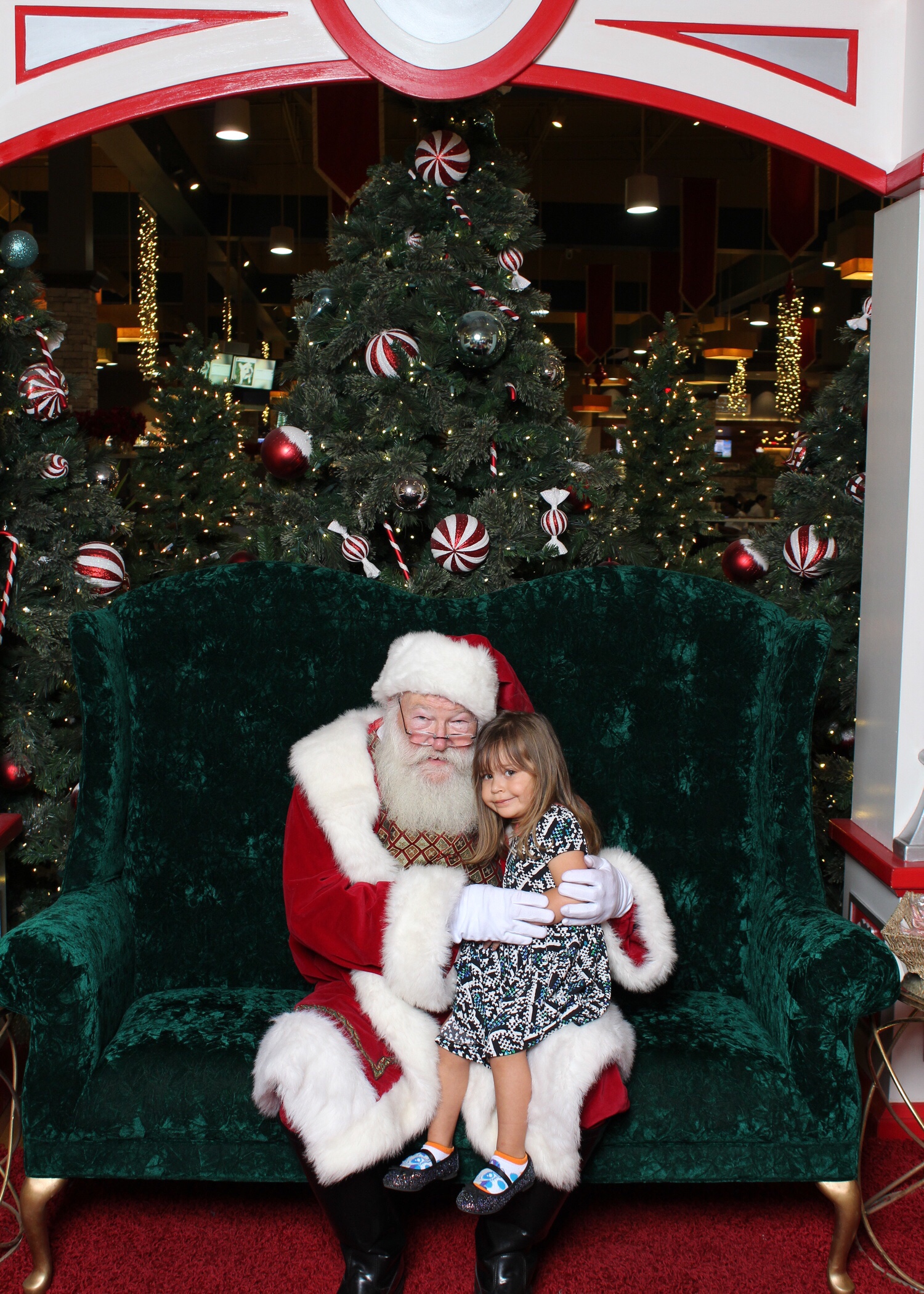 The night before we left we decided to take BB to go see Santa and eat dinner at Rainforest Cafe. This Santa impressed me and Nora was easily bribed to give us a decent smile 🙂 It was a bit different than the last couple times she saw him!
