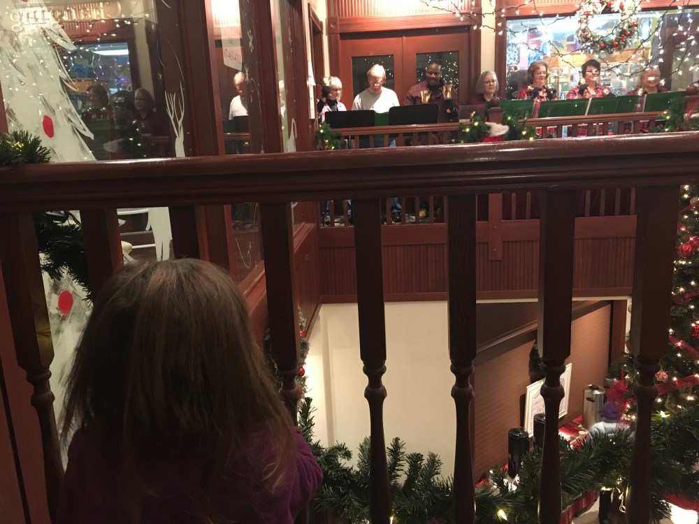 BB and I went to the holiday art walk and there were people playing hand bells. BB loved watching and dancing to the music. She also really enjoyed the food they were handing out.