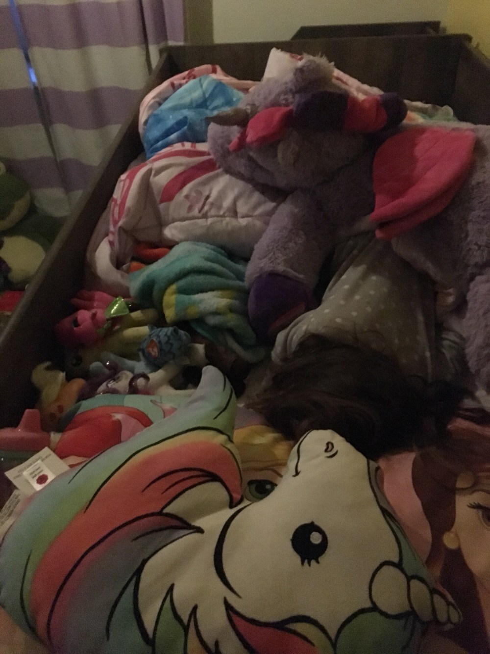 Can you spot the toddler? Sometimes BB sleeps with so much stuff in her bed we almost cannot find her… she’s so silly!